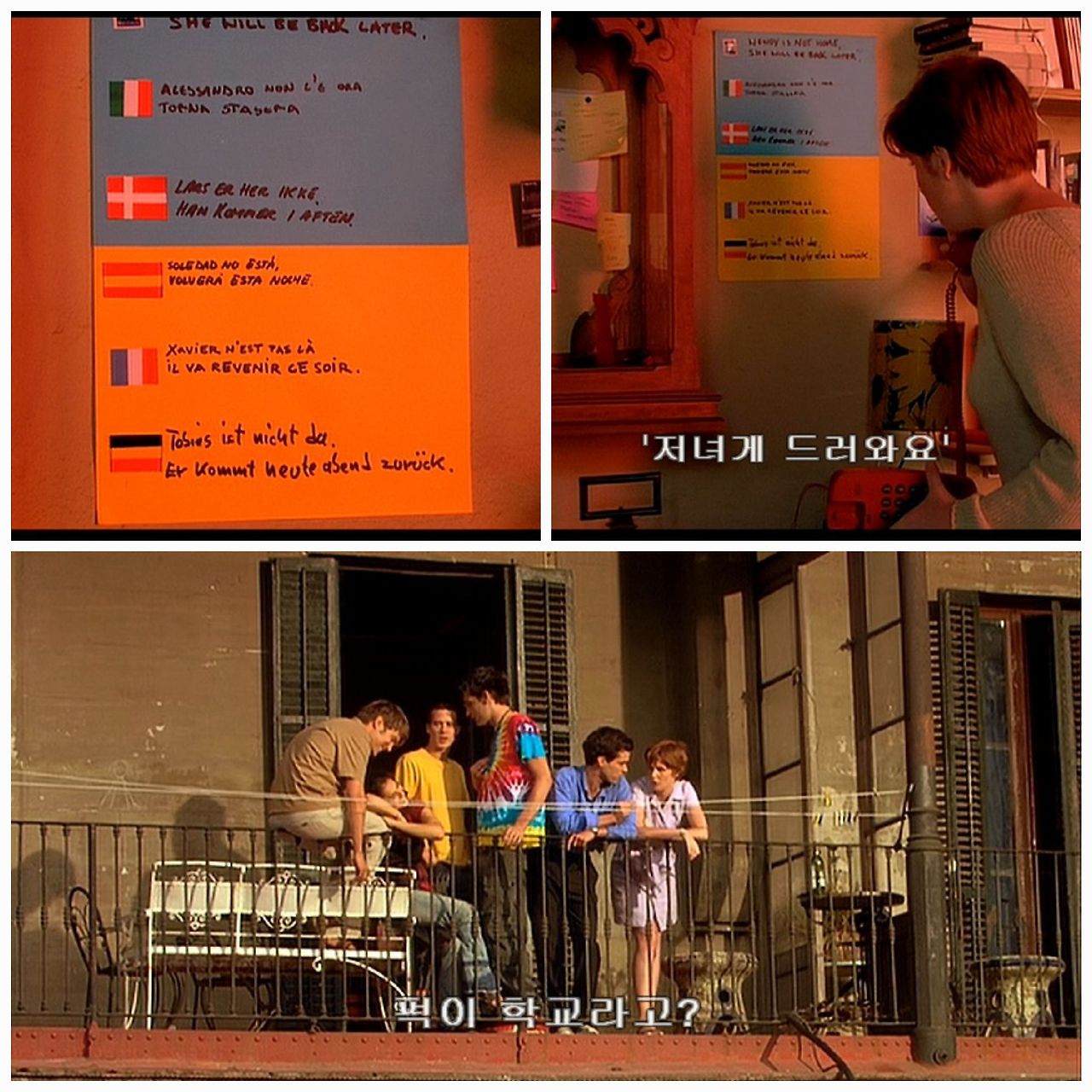 20년이 지난 지금도 이 영화를 떠올리면 가장 먼저 생각나는 장면이 있다. 아파트 현관입구에 공중전화처럼 유선 전화가 걸려 있었다. 각자 2G 핸드폰을 가지고 있는 시대였으나, 안부가 궁금한 가족들의 전화는 학생들이 집에 있을만한 시간에 집전화로 온다. 전화기 옆에는 "지금 학교에 가고 집에 없어요."라는 가족 응대 문구가 각 나라의 언어로 적혀 있다. 발음이 달라도 역시나 유럽어는 라틴어 계열이니 그다지 어려운 것은 없겠지 싶은데, 그 다른 발음의 누군가에게는 욕이라면 그건 참 큰일이다.
