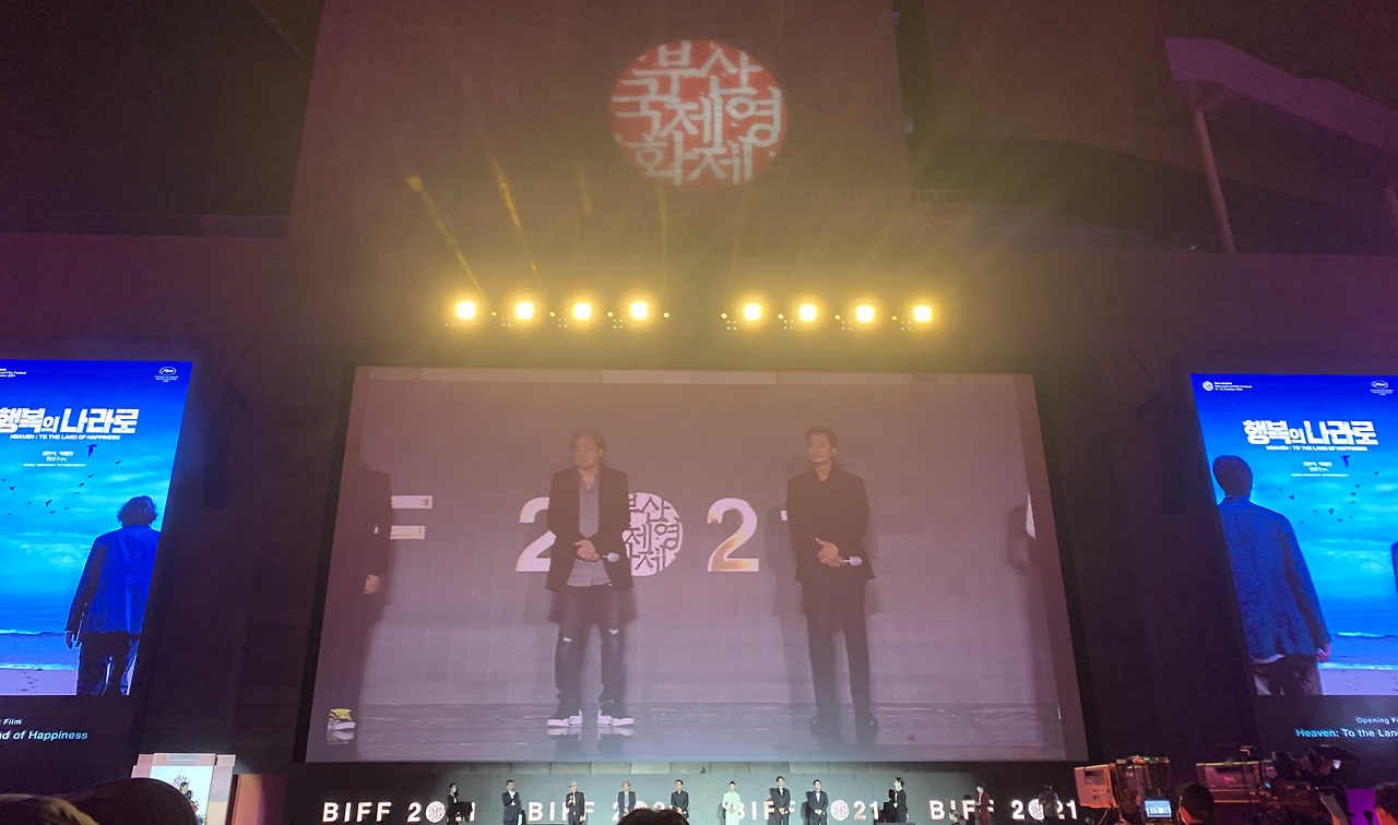 <행복의 나라로>의 감독과 배우들은 가장 마지막으로 레드카펫을 걸어 들어왔다. 화려한 옷과 화장으로 꾸민 다른 배우들과 달리, 최민식과 박해일은 수수한 옷차림을 하고 손을 흔들었다. 잠시 무대 위에서 감독과 배우들이 영화에 대한 소개할 시간이 있었는데, 그중 최민식 배우의 말이 꽤나 기억에 남았다. "너무너무 보고 싶었습니다." 잠시 숨을 고르고 뱉은 말은 짧았으나 그것이 담고 있는 감정은 크게 느껴졌다. 아마 그 자리에 있던 모든 영화인들이 공감할 수 있었으리라. 관객과 직접 만나기 어려운, 하물며 영화 자체가 개봉이 미뤄지고 있는 상황에서 BIFF가 무사히 개최된 것만으로도 감사한 상황이니 말이다.