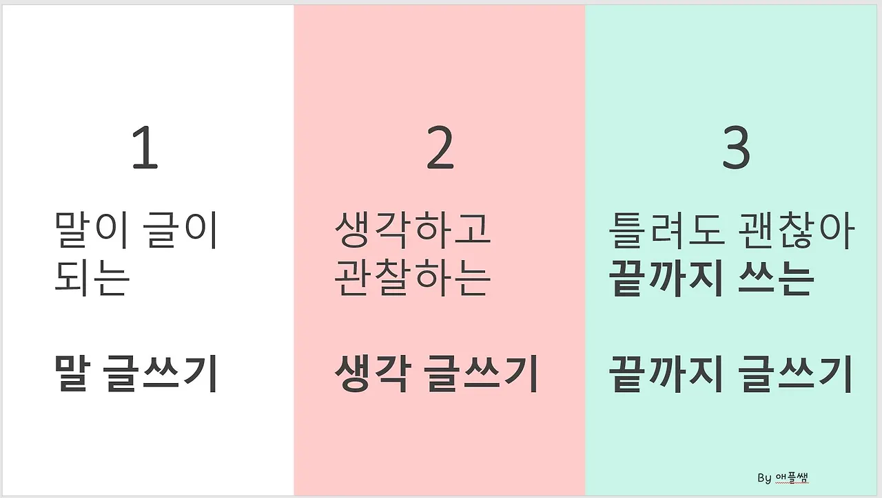 또 하나의 장애물은 어떻게 써야 할지 몰라 두려워하는 마음이 앞서는데, 제대로 배워본 적이 없어 그렇다. 어른들도 마찬가지다. 글쓰기를 배워본 적이 없는 사람들은 글을 쓰는 것. 백지를 채우는 것에 대한 두려움이 크다. 우선 백지 공포를 없애야 한다. 종이에 글을 바로 쓰지 말기. 먼저 생각을 하고, 말로 표현해 본 후 글을 써보면 글쓰기가 훨씬 수월해진다.