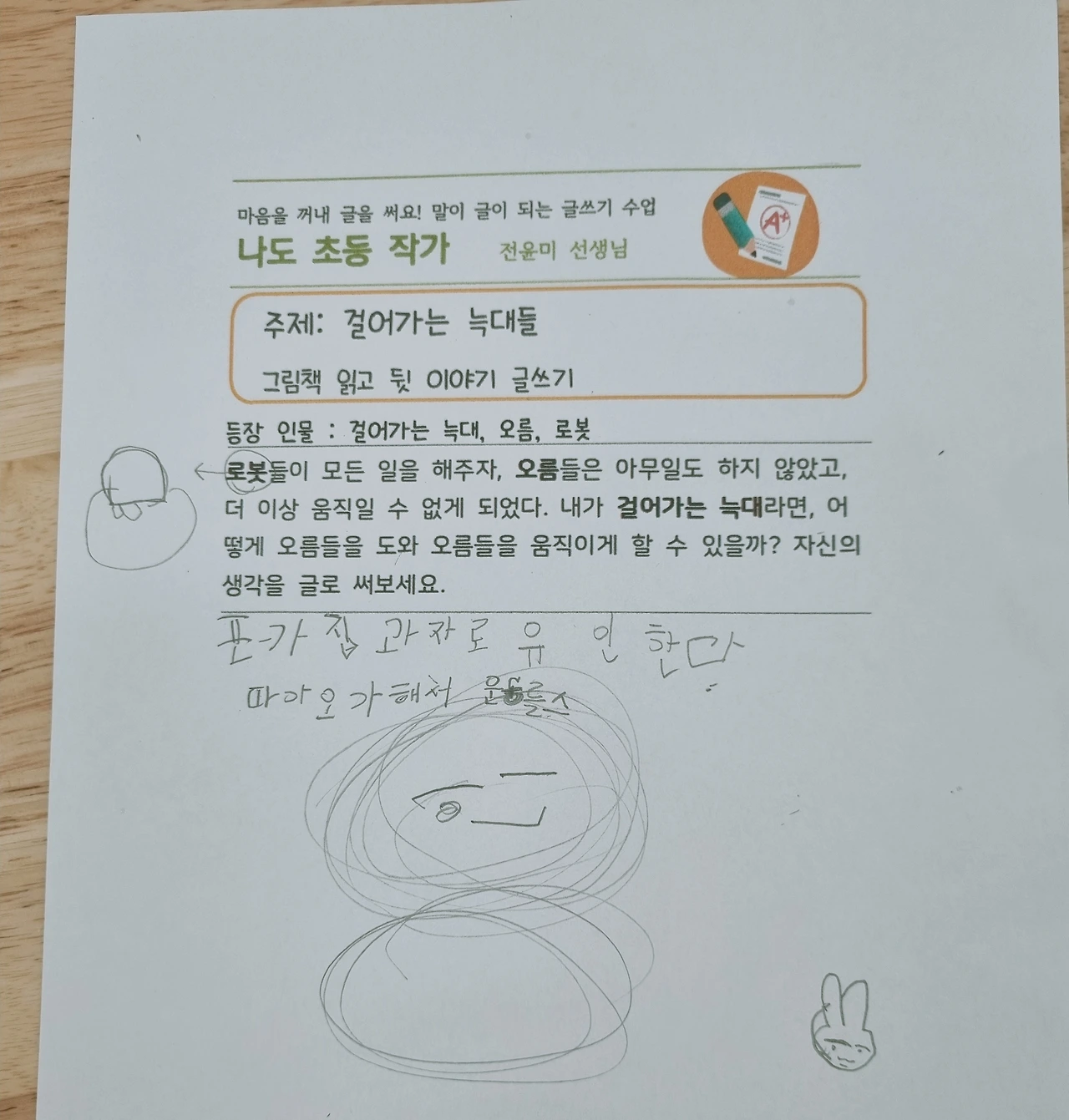 그동안 해왔던 글쓰기가 단답형이었기에 다소 긴 글쓰기가 어려운 아이들도 있었다. 어떤 아이는 질문을 이해하지 못해 계속 물었고, 몇몇 아이는 연필을 들지 못했다. 갑작스럽게 주제 글쓰기를 하라고 하니 당황한 눈치다. 역시 글쓰기 수업은 쉽지 않다. 아이들에게 말이 글이 되는 글쓰기를 알려주고 싶었다. 우선 대화를 나눴다.
