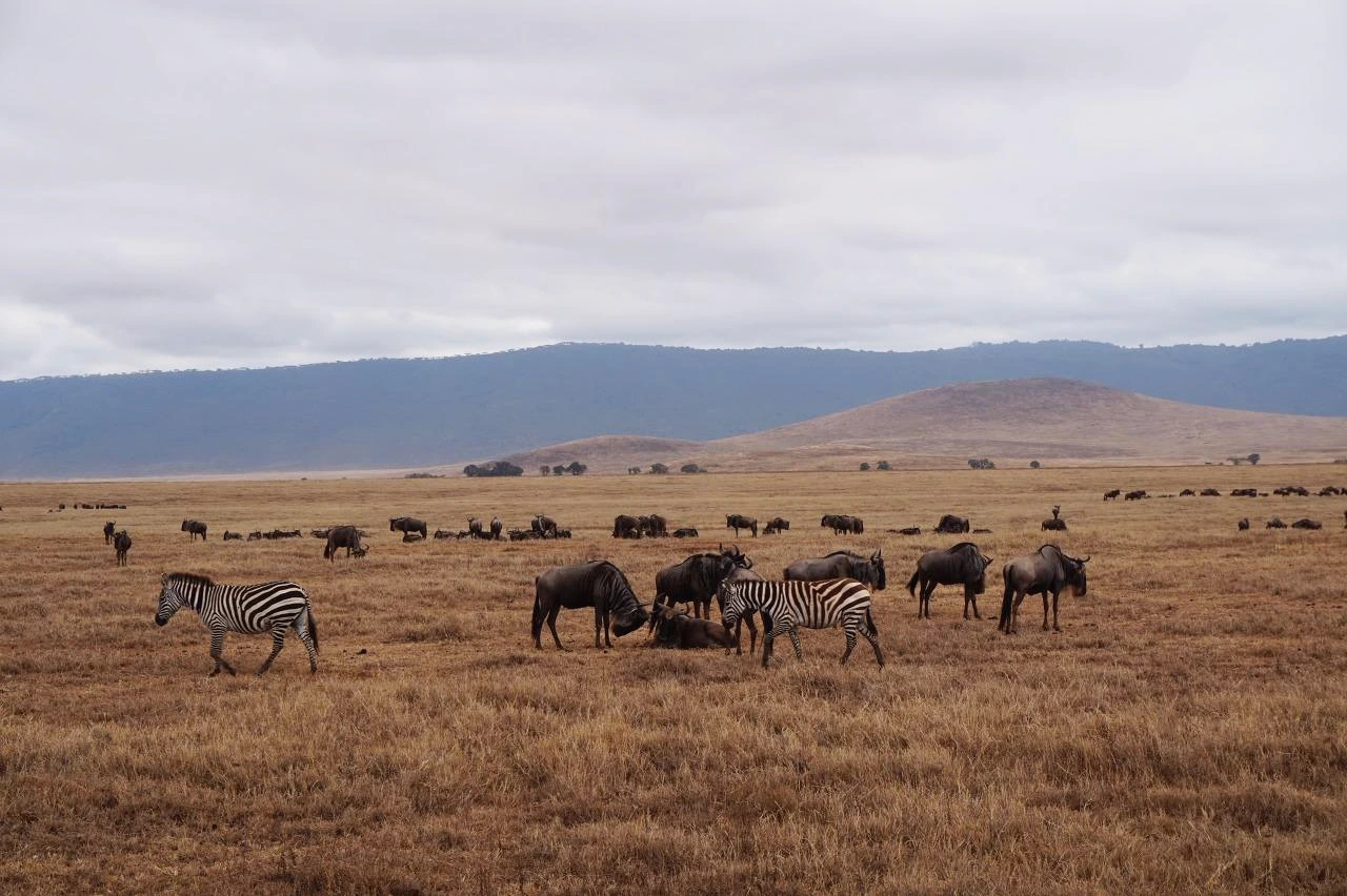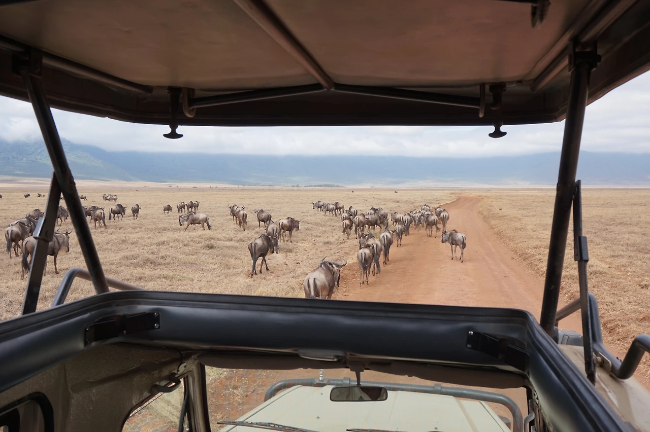 분화구 안에 들어서자마자 보이는 건 광활한 평지에 갖가지 동물들 뿐. 누, 얼룩말, 버펄로, 임팔라 등등 너무나도 평화롭고 태연하게 풀을 뜯고 있었다. 지붕이 열리는 사파리용 지프차에 탄 우리는 좌석을 밟고 올라가 차디찬 아침 바람을 얼굴로 맞으며 연신 사진을 찍었다. 하지만 나중엔 동물들을 하도 많이 봐서.. 좀 보기 어려운 동물이 나타나지 않는 한 좌석에 앉아 창문으로, 사진도 별로 찍지 않고 그냥 보았다. 분명 우리 인간들의 차가 시끄럽고 냄새도 날 텐데 동물들은 별 신경을 쓰지 않는 듯했고 바로 옆까지 다가오기도 했다.
