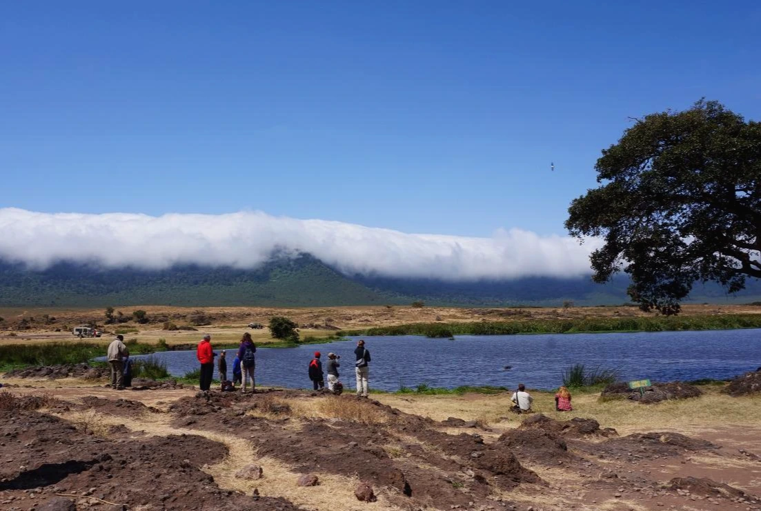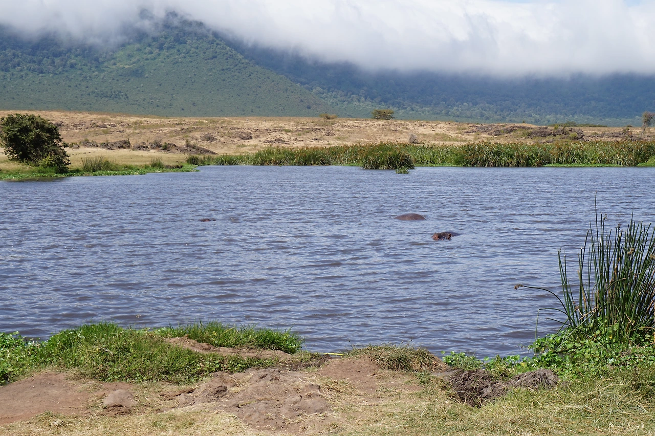 어느덧 점심시간이 되었고 우리는 아침에 배분받은 런치박스를 들고 차에서 내렸다. 우리가 점심을 먹을 곳은 잔디밭. 그런데 평범한 잔디밭이 아닌, 응고롱고로 분화구 안에 있는 잔디밭. 응고롱고로 분화구 안에 있는 맑고 커다란 호수 옆에 있는 잔디밭. 응고롱고로 분화구 안에 있는 맑고 커다란 호수 안에 있는 하마가 콧구멍을 내미는 걸 볼 수 있는 잔디밭이었다. 두더지 게임 마냥 중간중간 숨을 쉬려 콧구멍을 내미는 하마. 귀여워 ><