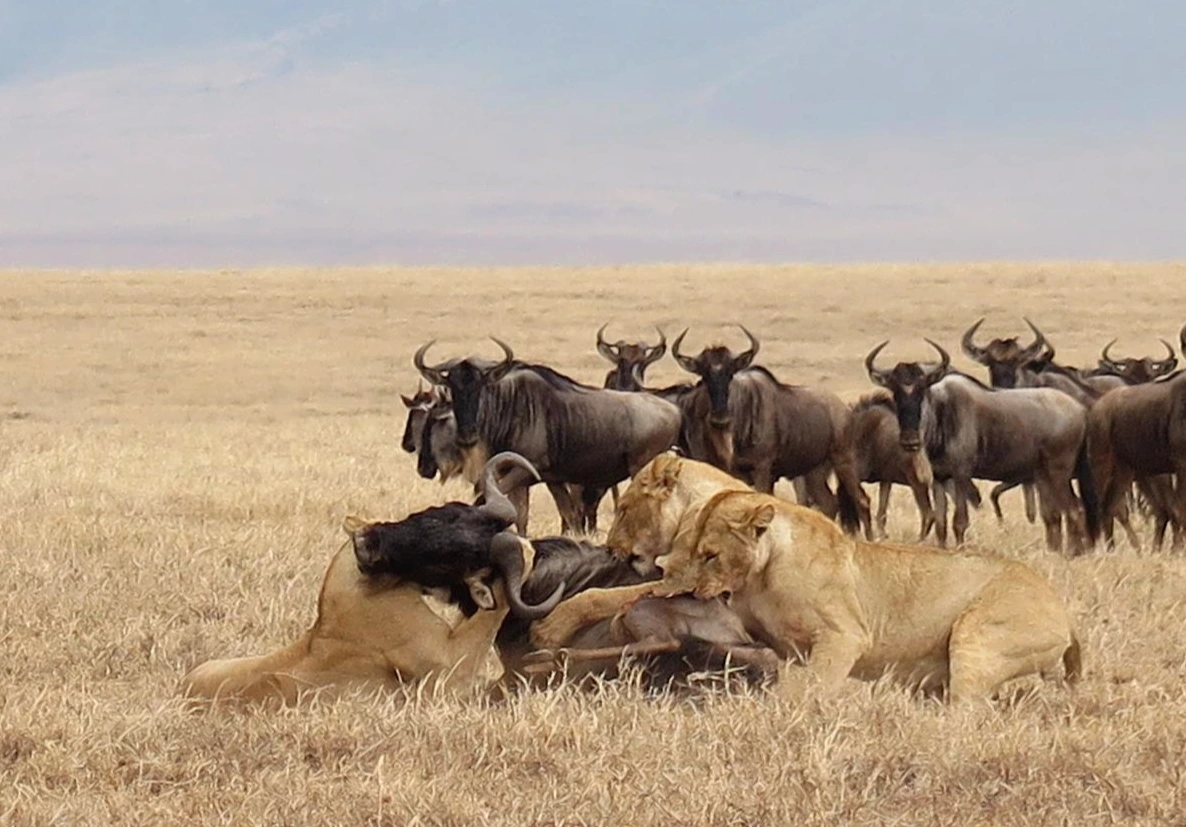우리의 능력 있고 친절한 운전사 애니스트는 우리가 사자를 좀 더 잘 볼 수 있도록 이리저리 차 사이를 파고들었고 우리 차는 어느 암사자 근처에 자리를 잡았다. 그리고 10여 분이 지났을까? 우리 바로 옆에 있던 암사자가 쏜살같이 우리 차 앞을 지나서 반대쪽에 있던 누를 사냥했다! 가만히 앉아있던 암사자가 갑자기 스프링처럼 튀어 오르는 장면부터 누의 목덜미를 물어뜯고 결국은 쓰러뜨리는 장면까지, 정말 코 앞에서 볼 수 있었다. 참고로 사자들의 협업 능력은 최고.
