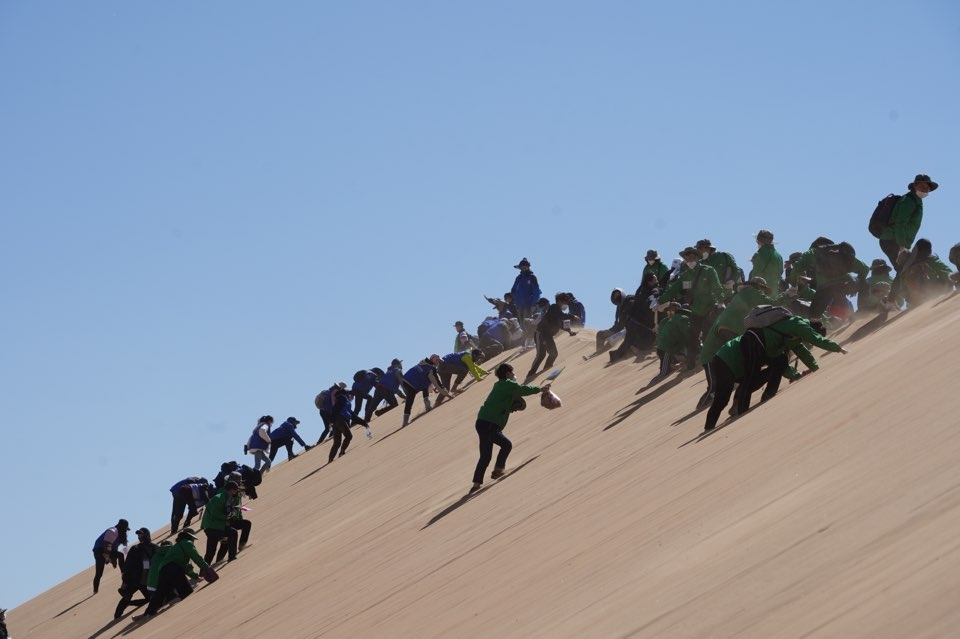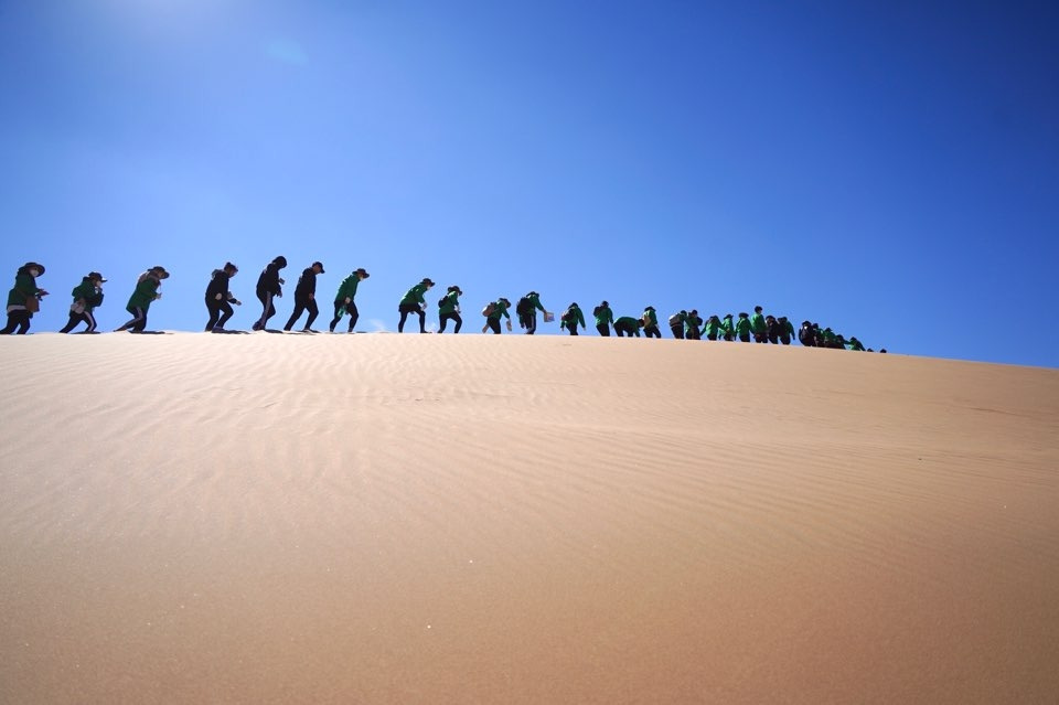 아직 낯설다. 신발 속을 파고드는 모래의 느낌. 가장 체력이 많았던 초반이었지만 가장 많이 멈춰 섰다. 신발에 조금이라도 모래가 들어오면 가던 발걸음을 멈추고 신발을 벗어 털어내기 바빴다. 점점 그 행위의 부질없음이 증명되고 신발을 손에 들고 맨발로 꼼지락 모래를 밟는 친구들이 많아졌다.