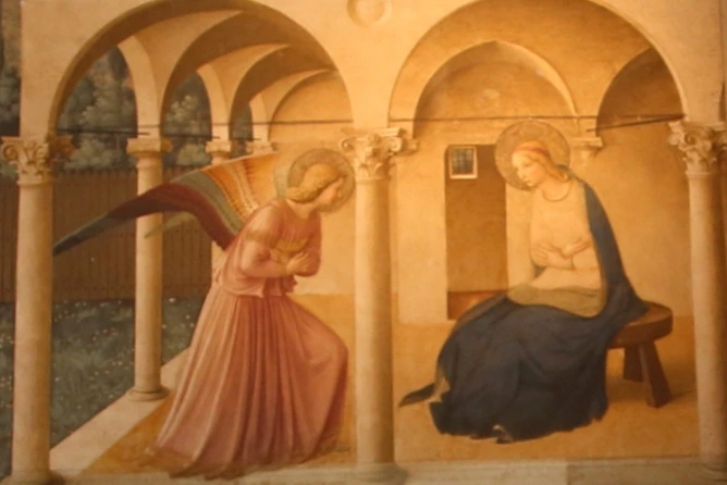 중세 화가들 역시 이 순간을 놓치지 않았다. 특히 르네상스 화가들은 하늘과 땅이 이어지는 이 순간을 경이롭게 그리곤 했다. 미켈란젤로와 다빈치, 보티첼리도 저마다 이 주제를 화폭에 담았다. 그중에서 가장 잘 알려진 작품이 프라 안젤리코의 <성모영보>였다. 그는 바로 옛 산마르코 수도원에 살던 수도자였다.