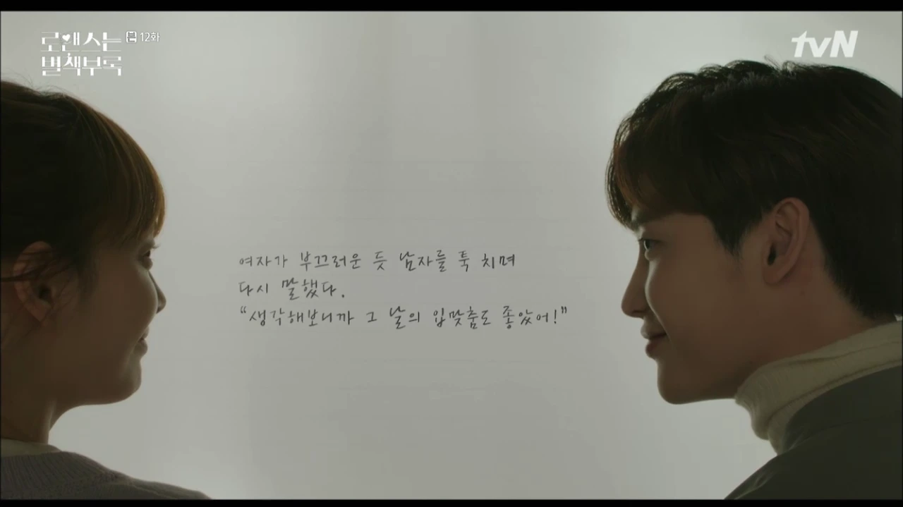책이 세상을 바꿀 수는 없어도 한 사람의 마음 정도는 따뜻하게 할 수 있지 않을까- 한 편의 책 같은 드라마가 우리의 마음에 남긴 말이다. 이나영의 푸릇한 풀 같은 예쁨과 이종석의 귀여운 청순함이 중심이 된, 가볍고 기분 좋아지는 책 한 권 같은 드라마였다.