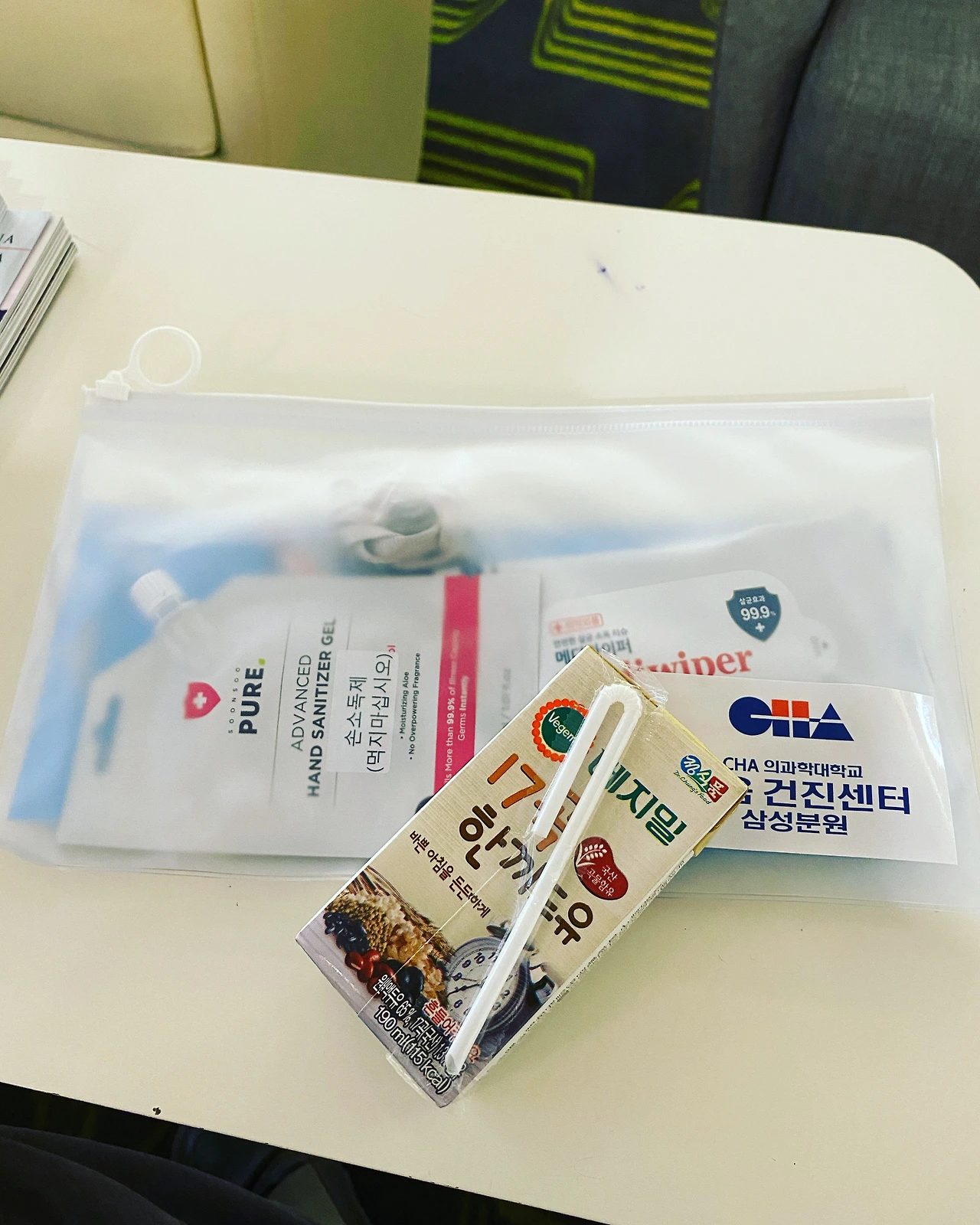 - 코로나 시대라 폐활량 검사 미진행이고 일회용 양말도 미지급.. 검진 후 코로나 시대라며 죽 대신 위생키트(사진) 제공