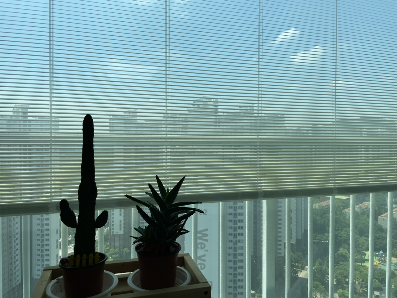 그래서 2/3는 내렸고, 또 틸트(경사) 버튼으로 경사를 줘 사진처럼 거실 유리창을 만들었습니다