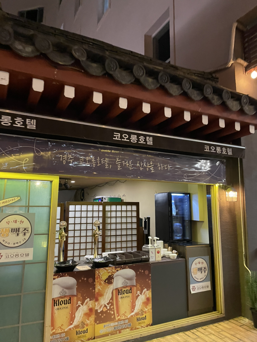 - 경주코오롱호텔 내 '달빛포차' 강추! 소세지, 감자, 바베큐, 꼬치 등등에 클라우드생맥주&막걸리 무한리필 패키지가 있는데 즉석 생음악(가수)에 분위기도 최고
