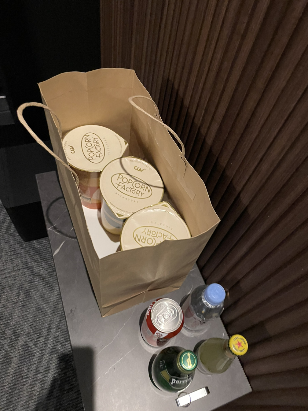 - 골드클래스는 별도 전용 라운지가 있었는데 프라이빗박스 이용 고객은 별도 휴식공간 없이 상영시간 10분전 입장시켜줘서 사진 찍고 들어가서 여유 부릴 시간이 부족 (*라운지 이용하게 해주세요 ㅠㅠ)