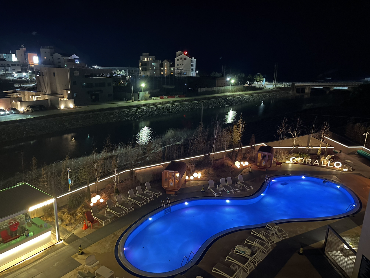 - 수영장이 인피니티풀은 아니지만 바다가 보이고 특히 원목개념 벌크통 같은 사우나가 최고(추위도 달래고 피로도 풀고).. 온수에 밤수영은 몽롱 그 자체니 사진 많이 찍어보시죠