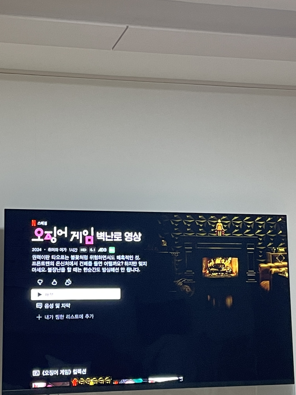 - 아~ 제대로 낚였습니다. 혹시나 하고 봤는데 정말 asmr 벽난로 영상이었음 (물론 배경 음악은 모닥불 타는 소리 + 오징어게임 그 특유의 사운드 함께 나옴)
