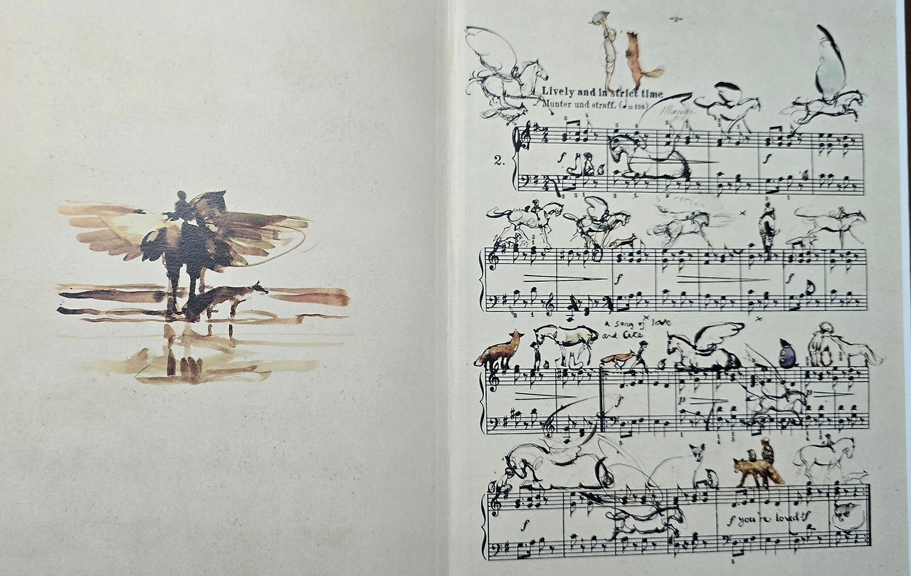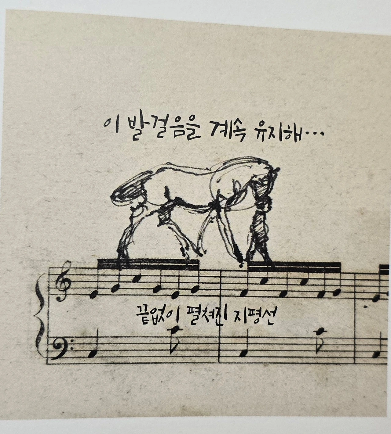 소년은 궁금한 것이 아주 많고 두더지는 케이크에 집착한다. 여우는 대체로 침묵을 지키고 경계심이 많다. 살아오면서 받은 상처 때문이다. 말은 크고 유순한 동물이다 그리고 원래는 날개가 있었다고 말한다. 책의 면지가 특이한데 날개 달린 말과 여우와 소년과 두더지가 피아노 악보 위를 신나게 뛰어다니며 노는 듯한 그림이다.