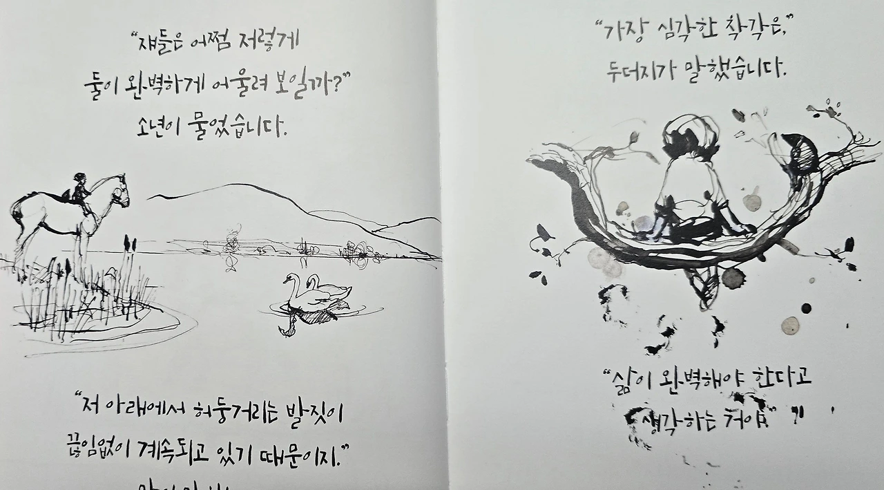 삶도 그러한 것 같다. 정처 없이 다니던 소년과 두더지는 여우를 만난다. 두더지와 여우가 함께 여행을 하는 건 흔치 않지만 두더지는 덫에 걸린 여우를, 여우는 물에 빠진 두더지를 구해준다.