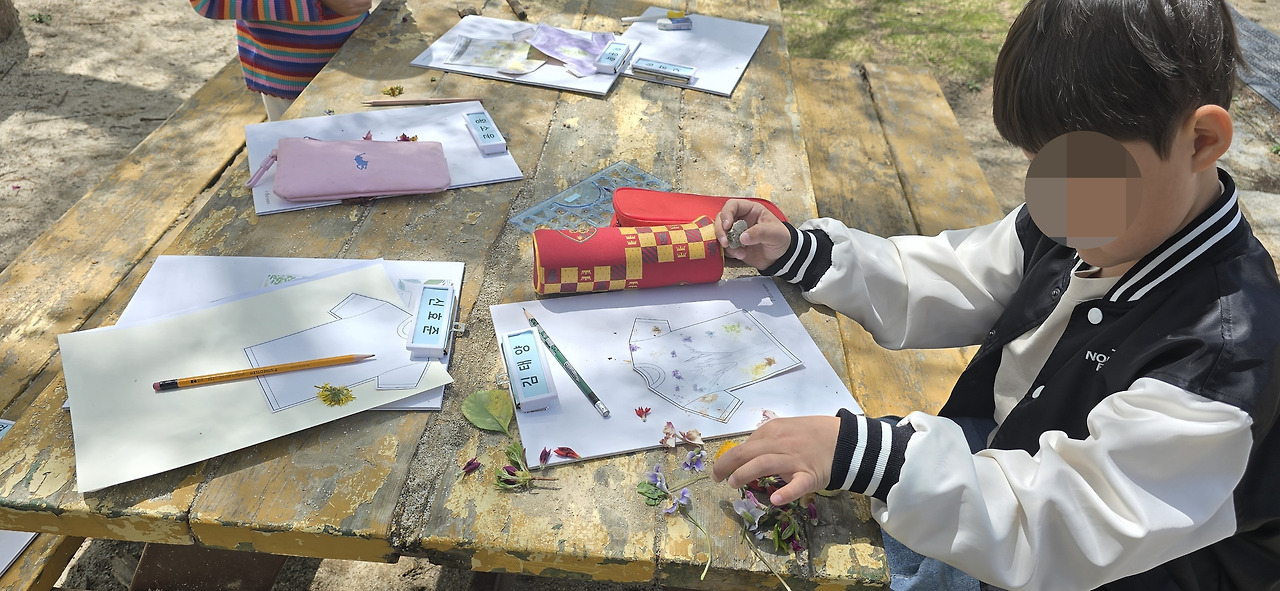 -2학년:주위 환경 생태를 소재로 셔츠 디자인 만들기였던 것 같은데 아이들의 자유분방한 교실에서의 의견 나눔이 인상적이다. 밖으로 나가서 직접 각양각색의 꽃잎을 빻아서 셔츠에 물들이는 작업은 이 학교에서나 가능한 일인 것 같다.