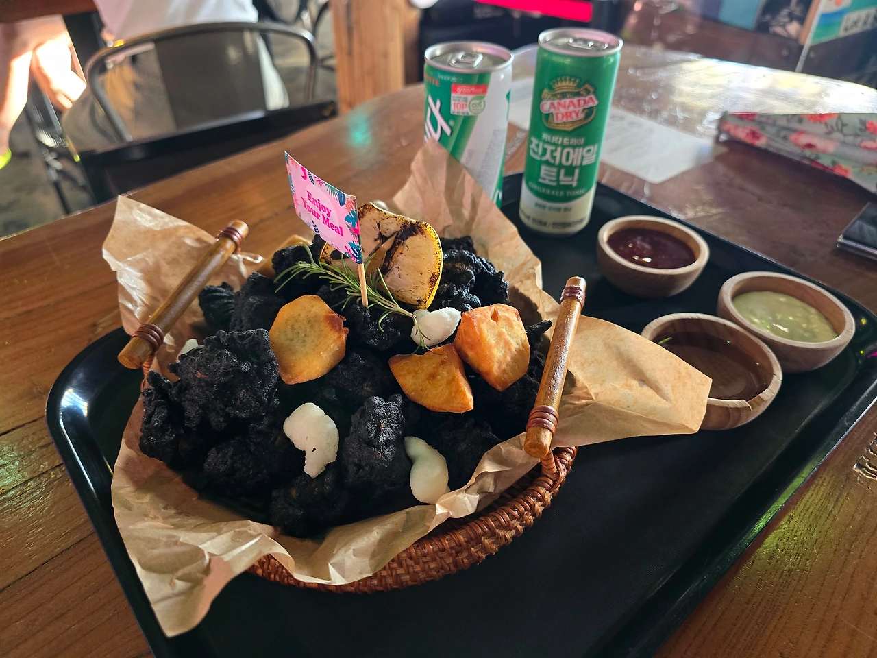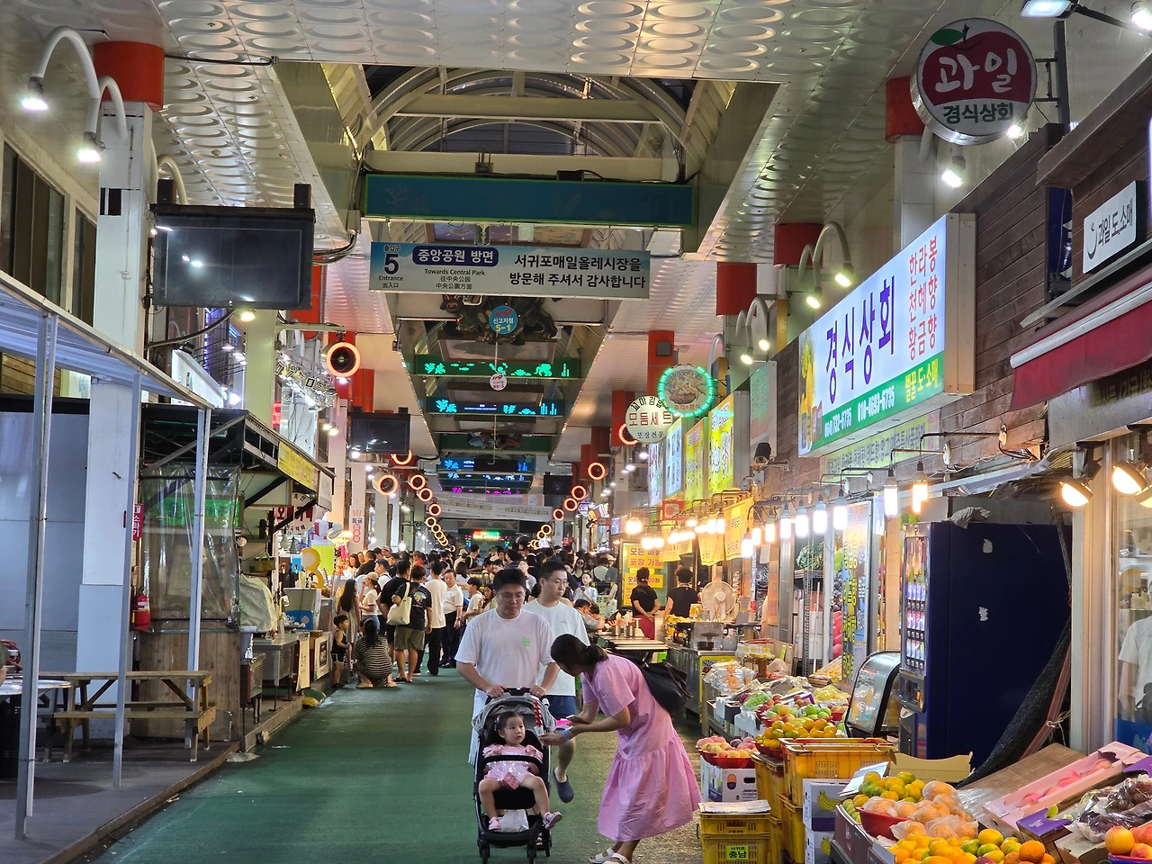 돼지고기 김치말이와 롤돈가스는 정말 인기가 많았다.줄도 길게 서고 기다리며 보는 불쇼도 재미나다.밤에도 찌는 더위에 불을 뿜어가며 열심히 돼지목살구이를,김치말이를 파는 젊은 청년들이 인상적이었다.마농치킨,물방울떡? 도 특이한 길거리 음식 중 하나였다.시장은 역시 야시장이 재미나다.먹을거리도 많고..