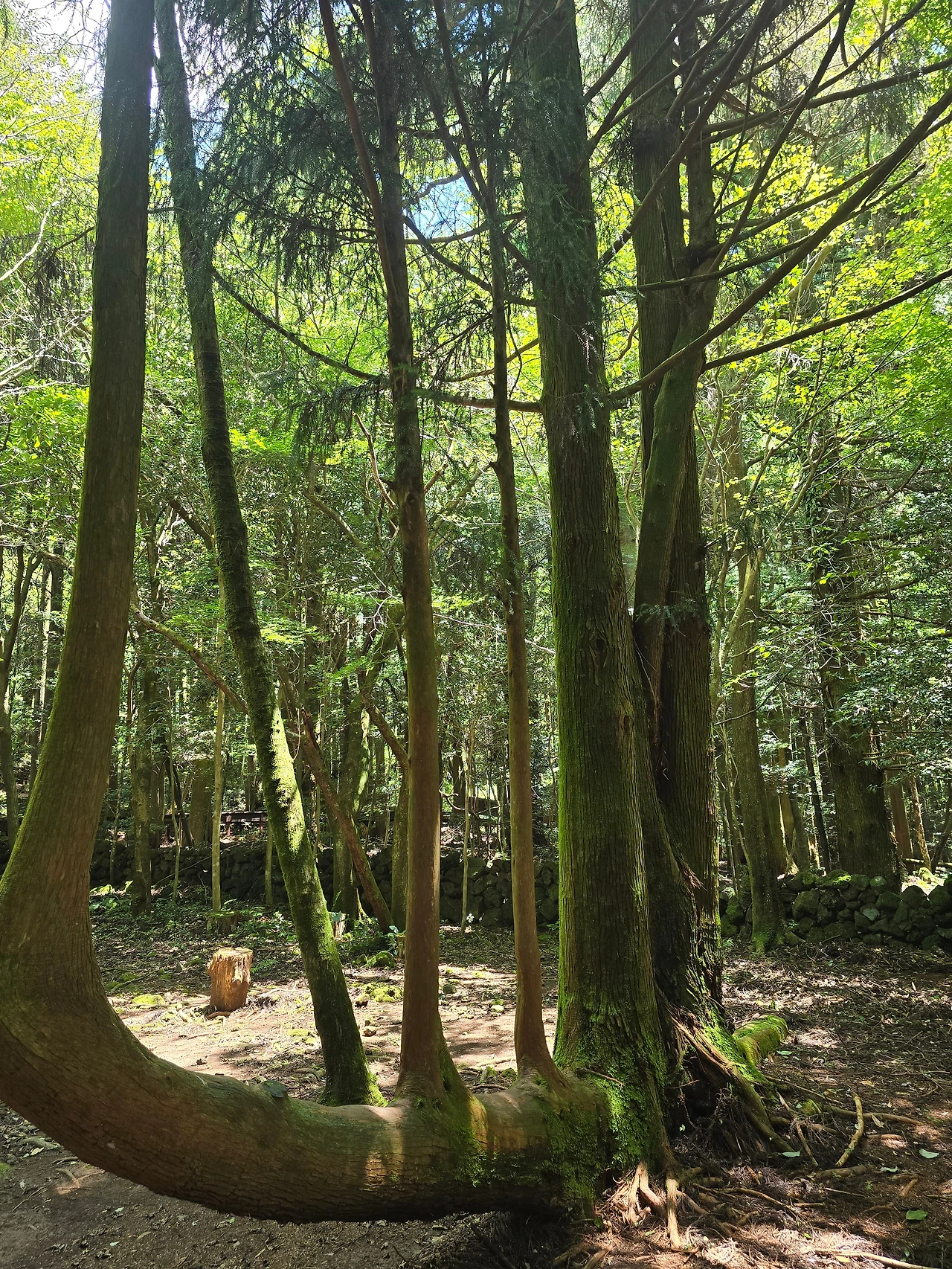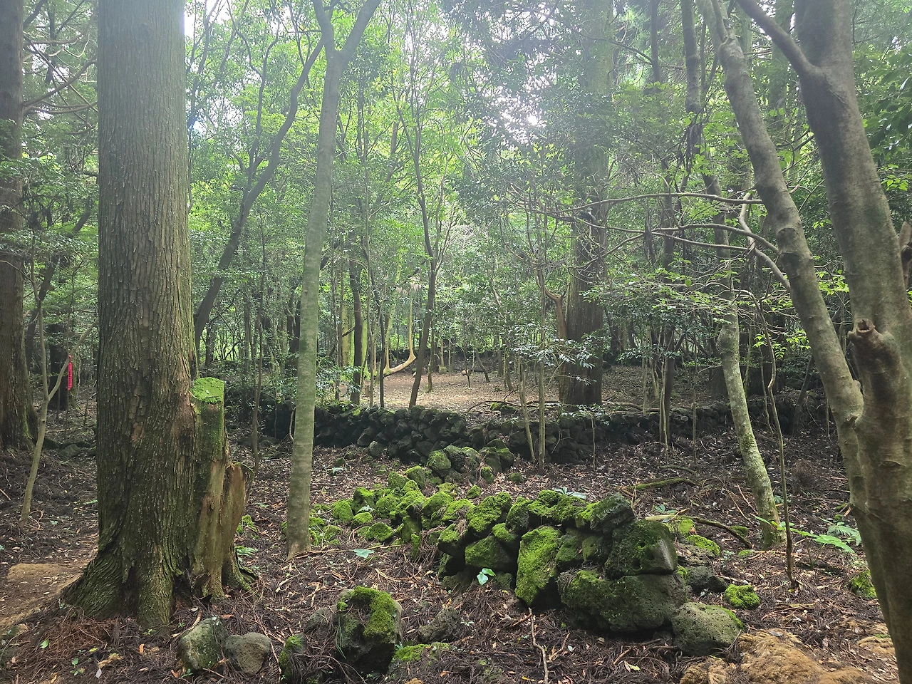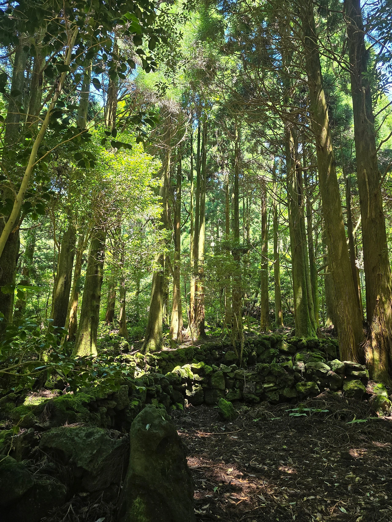 이 곳에서 터전을 잡고 살았던 조상들의 흔적들이 형무암 돌벽으로 곳곳에 보인다.숯을 구웠던 터,엄청 시워너한 바람이 나오는 숨골,동굴까지..세월의 흔적에 마음이 숙연해진다. 태풍으로 뿌리가 절반 이상 뽑혀도 아직 남아있는 뿌리로 옆으로 가지를 뻗어 살아가는 나무들도 보인다.생명의 강인함과 영속성을 느낀다.그것이 무성한 숲이 주는 힐링이 아닐까 싶다.