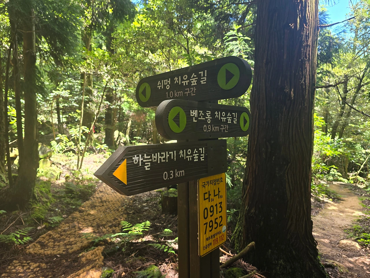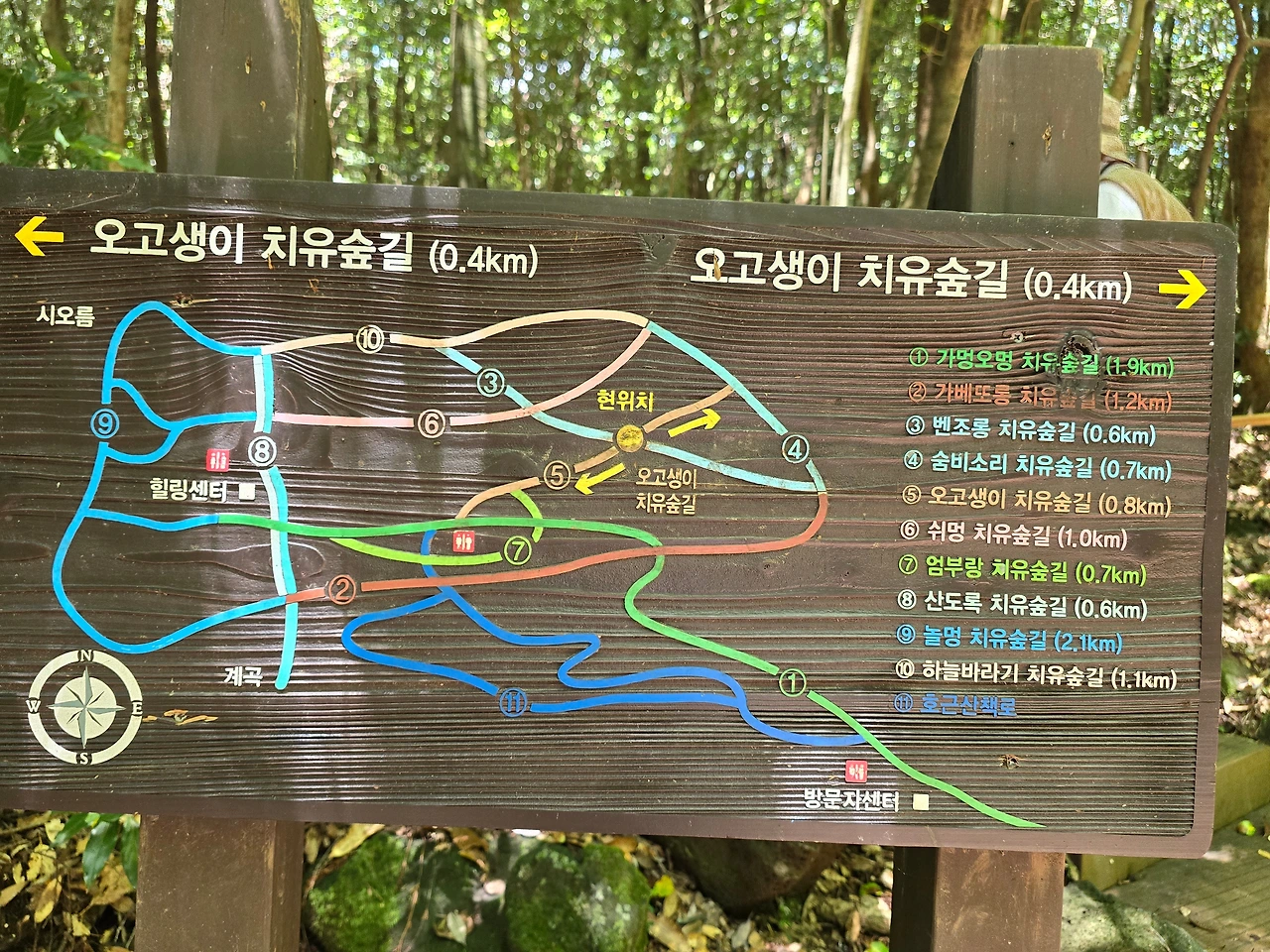 정말 힐링이 되었던 곳.아침부터 30도를 찍는 무더위라 10시에 해설탐방을 신청해 놓고 살짝 망설였는데 워낙 숲이 우거져서 햇빛도 없고 살랑살랑 바람마저 시원했던 곳이다.원래 100년정에 이 곳은 말을 키우는 목장부락이었다고 한다.일제시대 토지조사를 한다고 하며 주민들을 내쫓고 방목된 말들만 있던 황무지였는데 빨리 자라는 일제가 빨리 자라는 삼나무를 많이 심었다고 한다.그 밖에 상수리나무 홀씨들과 다른 나무들이 자라나 무성한 숲이 되었다고 한다.그래서인지 참나무,단단한 조록나무,붉가시나무,육박나무,밤나무등이 무성하다.물이 고이고 잘 부서지는 삼나무 틈으로 자란 표고버섯을 채취했다는 곳도 보인다.이끼가 있으면 삼나무,없으면 편백나무인데 편백나무 삼림욕장에 사람들이 해수욕하듯 누워서 휴식을 취하는 모습도 보인다.일본은 이 곳에 삼나무를 많이 심었는데 쑥쑥자라는게 특징인데다가 가벼워서 둥둥뜨는 성질을 이용해서 배를 만드는데 사용했다고 한다.조선의 전통적인 판옥선은 상수리나무,소나무(해송,육송,금강송)등을 쓴다고 한다. 천남성 나무도 있었는데 사약의 재료로 썼다고 한다.중죄인에게 임금이 내리는 사약의 '사'는 죽을 사자가 아닌 임금이 내린다는 뜻의 글자 賜藥 사약으로 쓴다고 한다. 사형(死刑)의 일종(一種)으로 임금이 죄(罪)를 진 왕족(王族)이나 신하(臣下)에게 독약(毒藥)을 내림. 또는 그 약(藥)이라는 뜻이다.