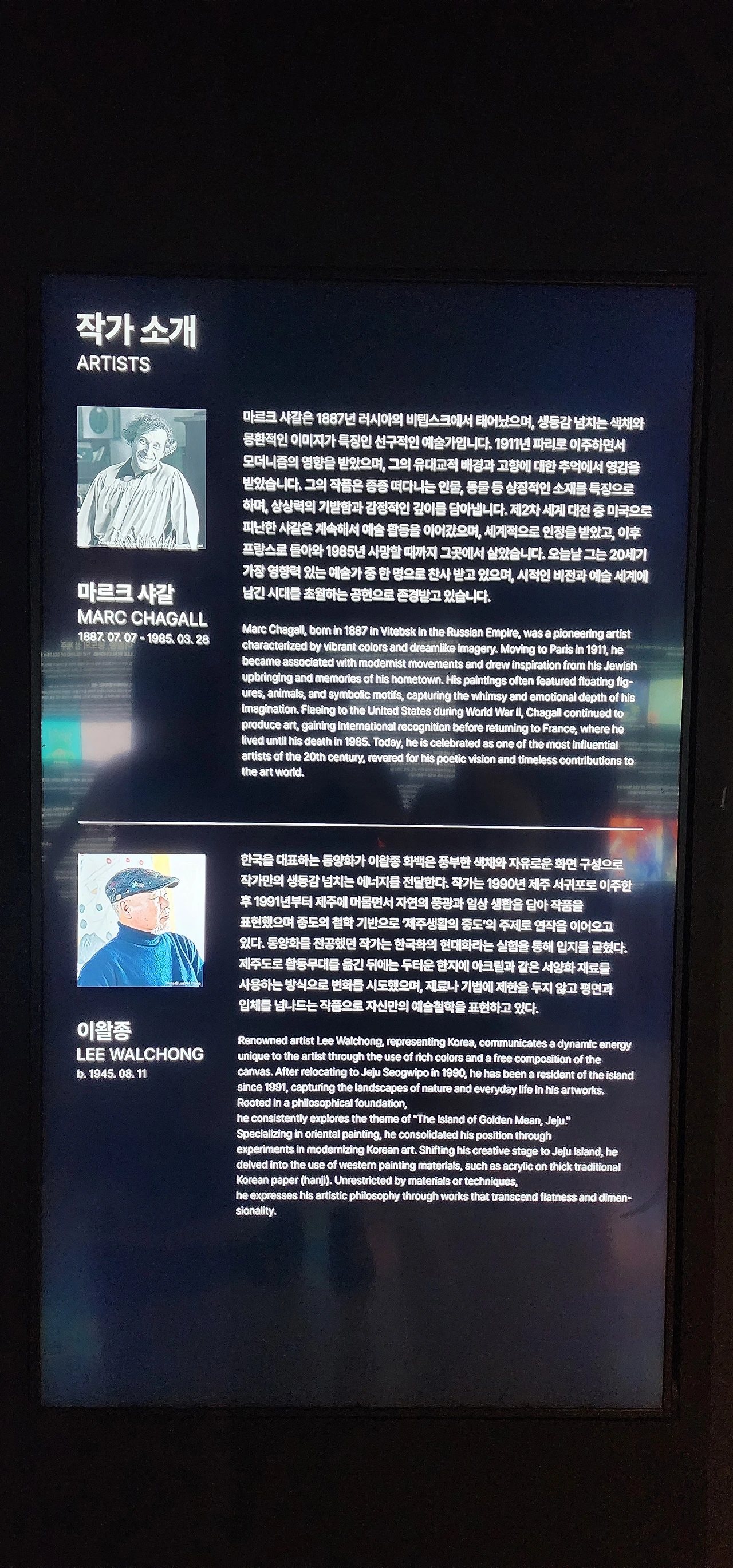 국가기간 통신시설이었던 이 곳이 몰입형 예술 전시관으로 바뀌었다.이번엔 제주작가 김왈종,그리고 샤갈의 작품으로 전시가 되었다.음악과 작품이 어우러져서 많은 울림을 주었던 예술 공간.그 옆에 있는 바움 커피 박물관도 가볼만 했다.커피의 연대,도구,원두의 종류와 로스팅,다양한 커피잔까지 볼거리가 많다.물론 커피와 바움쿠헨 케익도 별미!!
