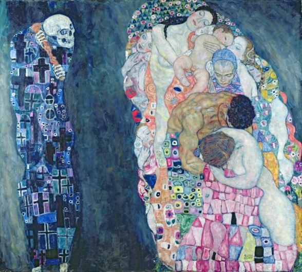 1911년 그는 ‘죽음과 삶’이란 작품을 남겼다. 그즈음 유럽에는 세기말적 비관주의가 유행하였다. 1908년 시칠리아 대지진으로 10만여 명이 목숨을 잃었고, 2년 뒤에는 핼리 혜성이 나타나 사회적 공포가 퍼져나갔다. 클림트는 해골과 무덤의 십자가를 통하여 죽음을 표현하였다. 죽음의 사신 옆에 성별도 나이도 인종도 모두 다른 사람들이 어느 하나도 내어주지 않겠다는 기세로 똘똘 뭉쳐 있다. 엄마 품에 안겨있는 갓난아이에서부터 손을 모은 채 기도하는 노파에 이르기까지 그들은 하나의 삶을 표현한다.