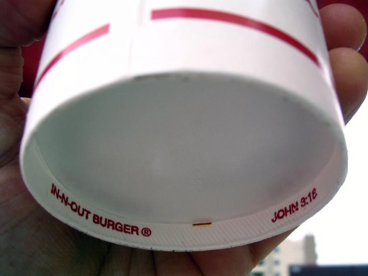 미국 3대 버거 중 하나인 '인 앤 아웃'(In&Out)은 음료수 컵 밑바닥에 눈에 보일 듯 말 듯 성경 구절을 써 놓았다. 모르는 사람은 찾기 쉽지 않다. 성경 구절을 써넣으려면 눈에 잘 보이는 곳에 써놓아야 하지 않을까? 이유가 궁금하였다.