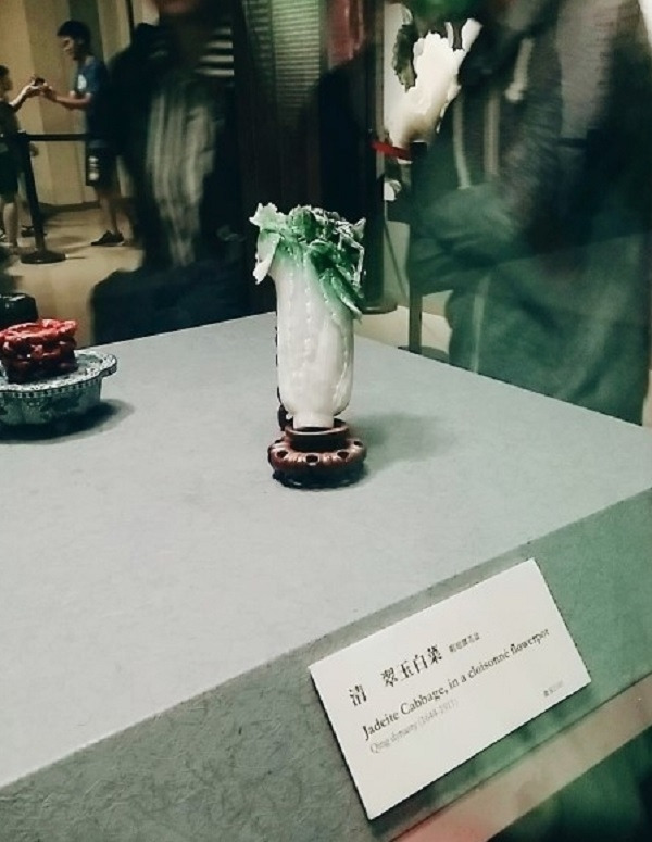 옥 빛깔의 아름다움과 정교한 이 조각은 청나라 말기 광서제의 왕비인 서비가 혼수로 들고 온 예물로 줄기가 투명하고 푸른 배추는 집안이 청백하다는 의미와 신부의 순결을 상징한다. 이파리에 여치 2마리는 여치는 번식력이 강한 곤충으로 딸을 시집보내고 금술 좋게 아들딸 많이 낳으라는 부모님의 마음을 담은 작품이다.