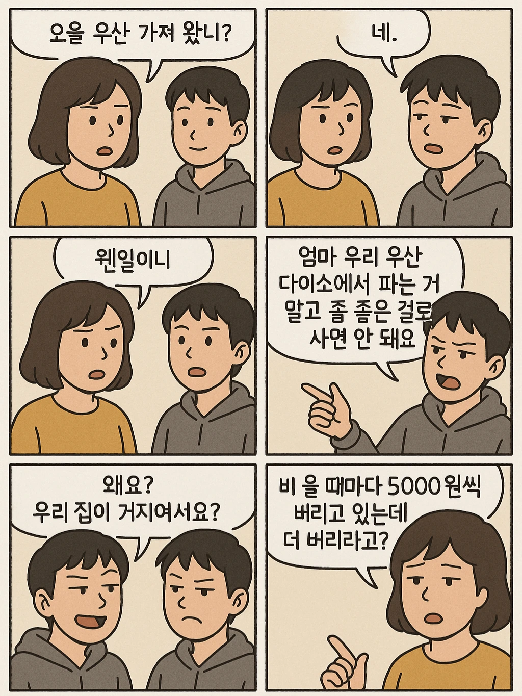 이런 상황에 사춘기 둘째는 다이소표 투명 우산 말고 좋은(?) 우산을 사놓으란다.