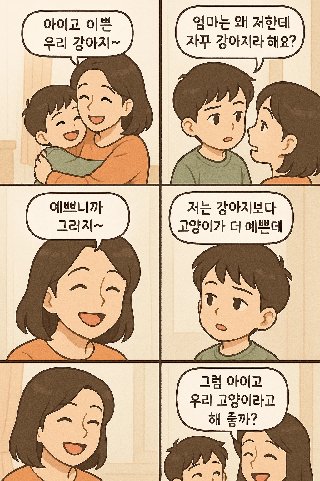 "ㅎㅎ 그래 그럼 엄마는 이제부터 '예쁜 강아지' 말고 '예쁜 고양이'라고 해 줄게."