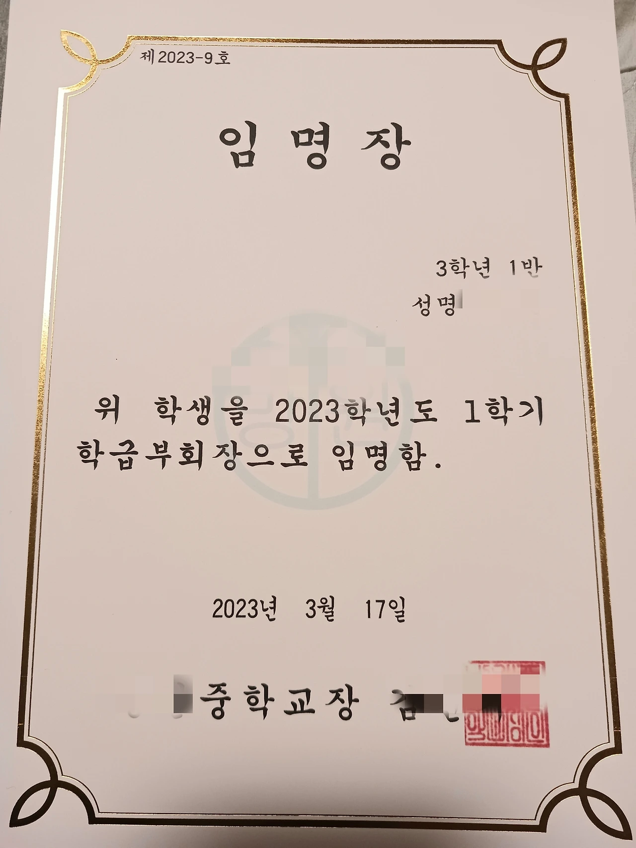 학교에서는 날짜보다 하루 일찍 임명장을 수여한 모양이다