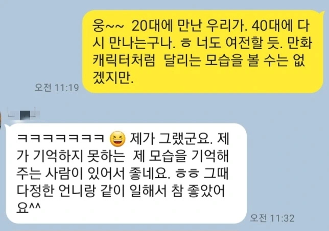 그러고 우리는 10여 년의 시간이 흐른 뒤에 오늘 만났네. 근데 어머나... 그대로인 거야. 20대 파릇파릇하던 때 만났던 우리가 40대가 되어서 다시 만났는데... 그대로야 그대로~ 그 친구와 같이 회사 다닐 때, 아침마다 그 친구의 출근하는 뒷모습을 보며 내가 웃었거든. 만화 캐릭터처럼 다다다다 뛰는 모습이 너무 귀여워서. 이제 그런 모습을 기대하긴 어렵지만 얼굴만은 그때의 기억을 떠올리게 했어.