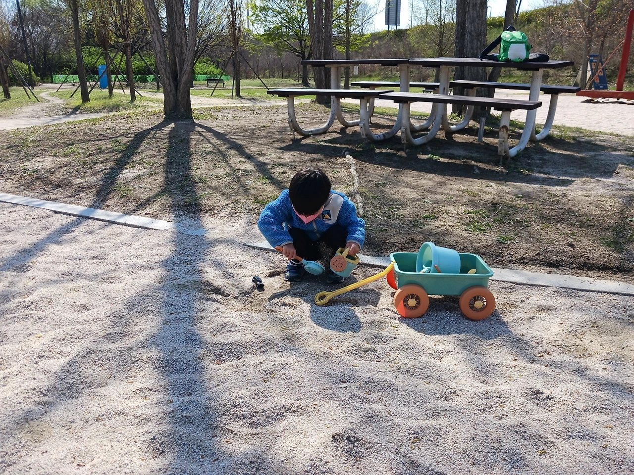 5시가 넘어가니 그늘 한 점 없던 놀이터가 그늘로 바뀌었어. 바람도 차가워졌지. 신발을 벗고 놀았는데, 양말과 바지는 이미 젖은 모래로 범벅이 돼 있었어. 초록이 감기가 다 낫지 않은 상태라 걱정이 돼서 서둘러 놀잇감을 챙겼어. 초록이는 더 놀고 싶다고 버텼지. 좀 더 놀게 한다고 해서 초록이가 만족하며 집에 갈 것 같지도 않았고, 이대로 놀다가는 초록이 감기가 더 심해질 것 같아서 초록이를 달래서 집으로 향했어.