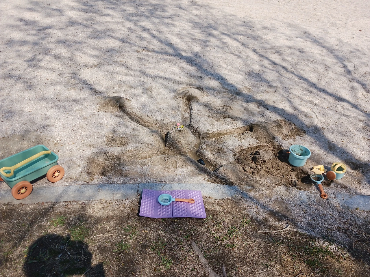 한강놀이터에 도착했는데, 아무도 없는 거야. 사실 초록이는 혼자 연습을 좀 했거든. 이걸 가지고 놀이터에 가면 누군가가 같이 놀아도 되냐고 물을 것을 대비해서 말이지. "엉 놀아도 돼!" 이 말을 준비하고 갔는데, 아무도 없네! 준비한 말을 써먹지도 못하고 우리 둘이서 사이좋게 땅을 파고 길을 내고 물을 뿌려 케이크도 만들며 놀았어.