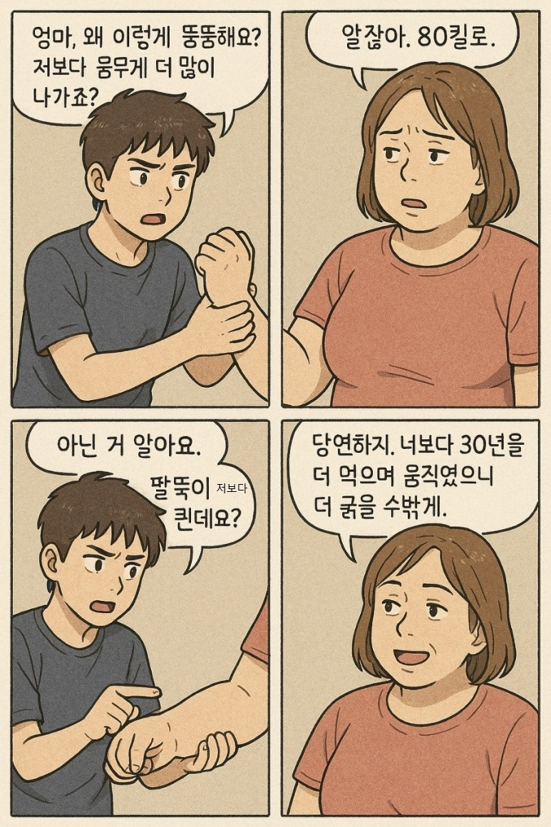 수개념이 별로 없던 어린 시절부터 나에게 엄마 80킬로그램이냐고 놀렸던 기억이 떠올라 당당하게 "엄마 80킬로그램인 거 알면서 왜 그러냐."라고 아무렇지도 않은 척 말해 본다.(사실은 너보다 키는 작지만, 몸무게 더 많이 나갈지도 몰라.)