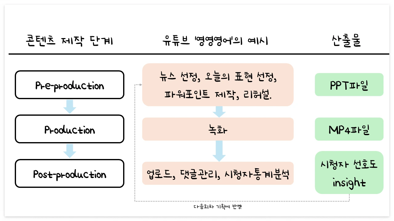 모든 창작은 세 가지 단계로 나눌 수 있다. 기획(Pre-production), 제작(Production), 후반작업(Post-production)으로 말이다. 내가 만드는 영어교육 유튜브 <영영영어>를 예로 들면, 뉴스를 선정하고 오늘의 표현을 찾아내고 이를 기반으로 파워포인트를 만들고 리허설하는 것이 기획단계에 해당하겠지. 실제로 이 파워포인트를 넘겨가며 강의하는 것을 녹화하는 게 제작, 그리고 메타데이터를 작성하여 업로드한 뒤, 조회수, 좋아요, 댓글 등 시청자 반응을 분석하는 게 후반작업에 해당할테고.