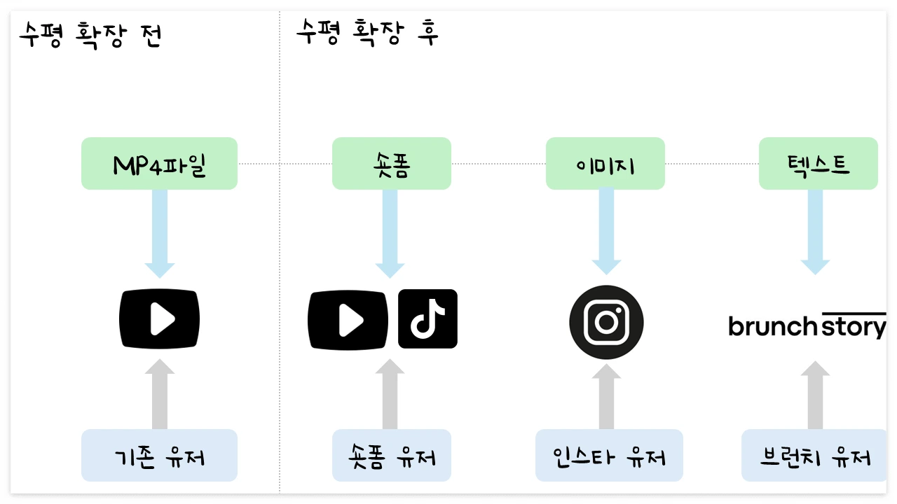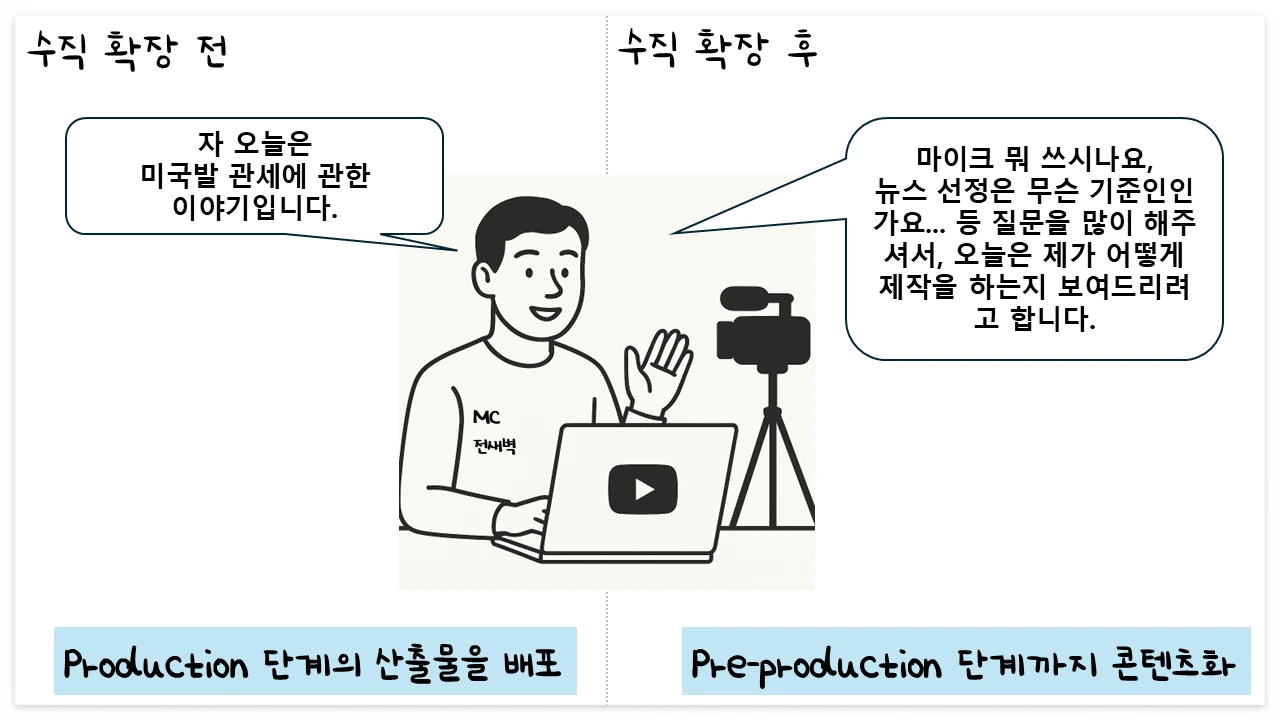 한편 다른 방식의 확장도 있다. 바로 완이 네가 생각한 방식이지. 이 경우 제작 단계에서 나온 산출물(본편)을 다양한 형태로 가공해 채널을 확대한다. 원소스멀티유즈(one source multi use)라고도 표현하는데, <들어주길> 방송원고를 텍스트로 만들어 블로그에 올리고, 이미지로 편집해 인스타에 올리는 것과 같은 형태다. 이건 네 채널을 보던 시청자를 넘어, 더 많은 구독자를 확보하고 싶을 때 쓰는 홍보수단이다. 이건 수평적 확장에 해당한다.