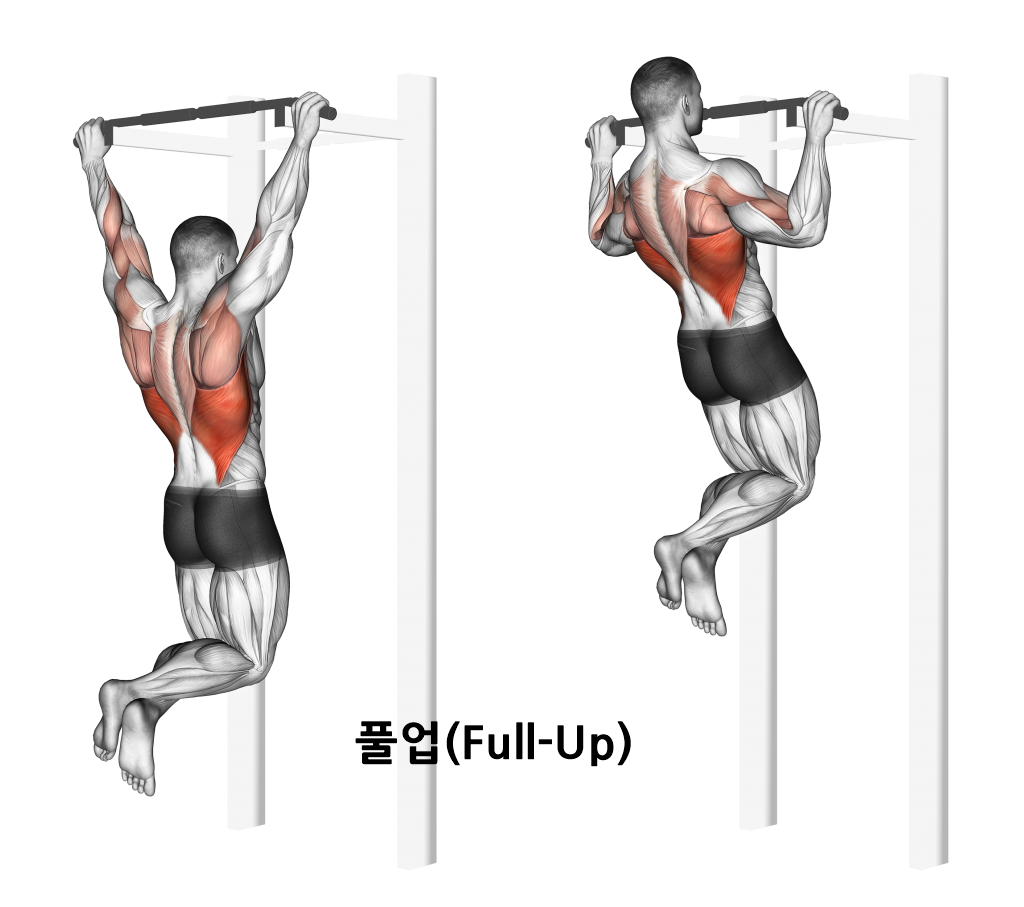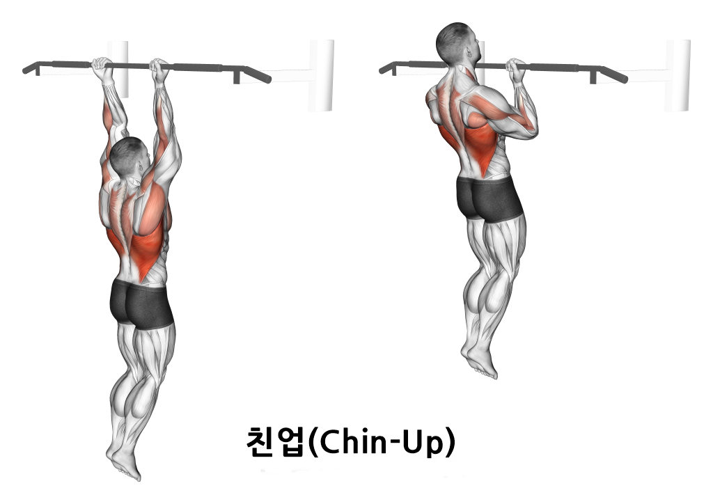 친업은 아래 그림처럼 손바닥이 안쪽으로 향하게 철봉을 잡는 것이다. 두 경우, 근육이 자극받고 활성화되는 부위는 그림의 빨간색 근육 부위를 참고하면 되겠다.