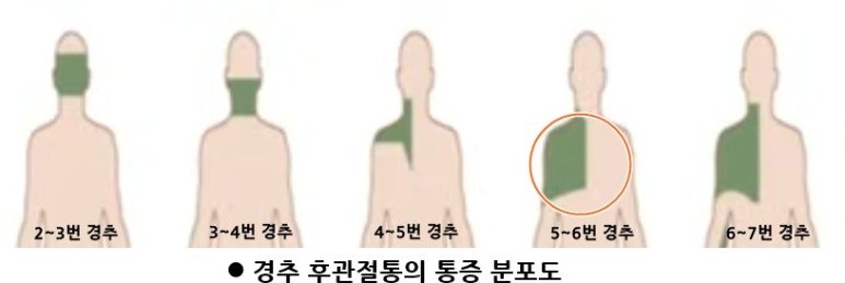 5. 목 디스크에 문제가 있을 경우, 어깨에는 연관통도 방사통도 모두 나타날 수 있다. 이 경우, 연관통은 승모근, 어금니, 귓속, 머릿속, 눈, 가슴 등 다양한 위치에서 나타난다. 반면, 방사통은 경추 주변의 신경절에 디스크 수핵이 묻어서 염증이 생기면서 시작되며, 이것이 신경절을 따라 어깨, 팔, 손가락까지 방사형으로 내려온다.