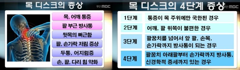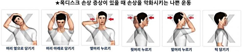 1. 목디스크는 허리디스크와 다르게 적절한 치료를 할 경우 대부분 어느정도 시간이 지나면(대략 6주~수개월) 증상이 호전되며 자연적으로 회복된다. 특히 적절한 보존치료와 함께 지속적인 신전동작을 병행할 경우 목디스크 회복 시간은 크게 단축된다. 목디스크 증상을 가벼이 여기고 계속 방치할 경우, 거북목이나 일자목으로 굳어져 만성피로, 만성두통, 어지럼증 등을 달고 살다가 결국엔 만성적인 디스크 탈출증으로 호되게 고생하게 된다.