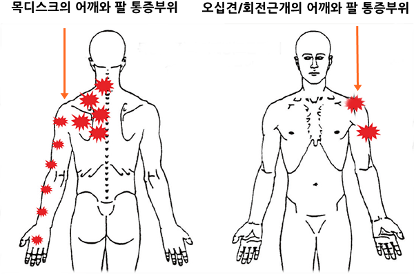 6. 어께와 팔의 통증은 목디스크 탈출증, 오십견, 회전근개 손상 모두 연관통이 비슷하게 나타난다. 따라서 전문가인 의사의 정확한 진단을 통해서 반드시 구별해야 한다. 목디스크 탈출로 인한 통증의 경우, 팔을 어깨 위로 들어 올리거나 돌리는 것은 자유롭다. 이때 목디스크 탈출증인지 자가 확인방법은, 고개를 아픈 쪽으로 돌리면서 뒤로 젖히면 어깻죽지와 팔에 통증이 갑자기 심해진다면 목디스크 탈출증이다. 또 아픈 팔을 등뒤로 꺽어 견갑골 방향으로 올렸을 때 견갑골 주변에 심한 통증이 온다면 목디스크 탈출로 인한 연관통이다. 또 아픈 쪽 손으로 목덜미나 뒤통수를 잡아서 통증이 완화된다면 목 디스크 탈출증이다.