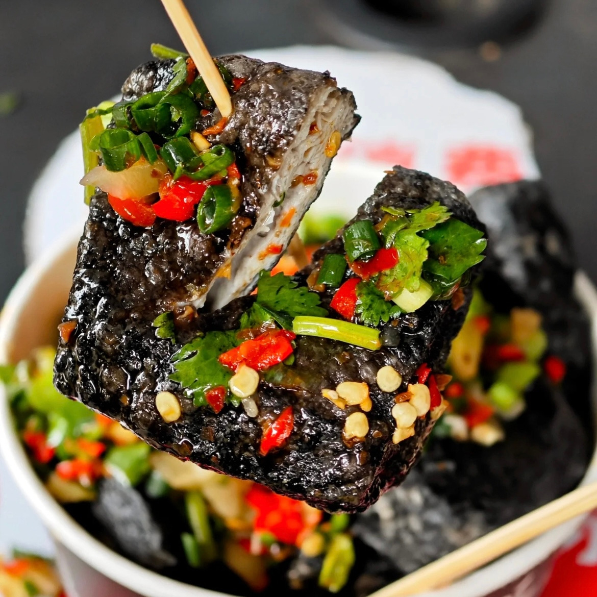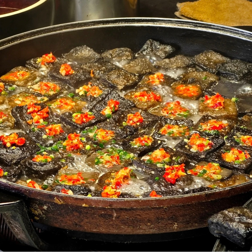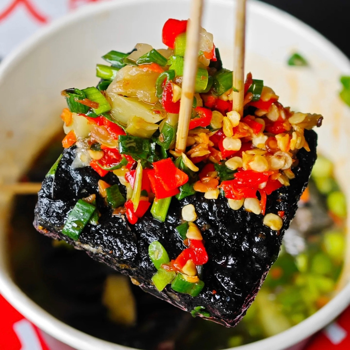‘취두부’는 우리의 청국장과 비슷한 ‘발효‘ 시킨 두부라서 냄새가 고약하다. 이 두부를 탁한 갈색을 띤 기름에 바짝 튀겨, 식초•설탕 등을 넣고 절인 고추와 파, 갖가지 조미료들을 넣어 만든 ’ 다진 양념’ 비슷한 느낌의 양념을 얹어 먹는 것으로 겉은 바삭하고 두부 속은 탱글탱글한 것이 특징이다.