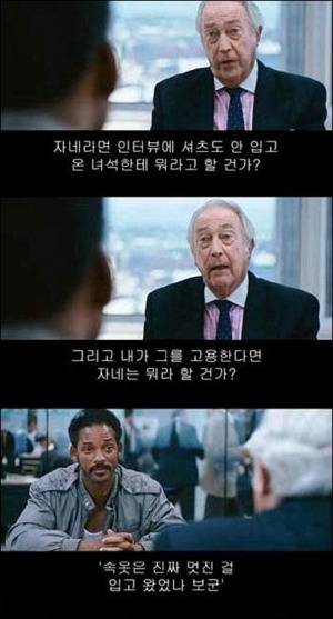 팬티가 뭔 대수겠냐만은 영화 '행복을 찾아서'에서 윌 스미스가 면접에서 당당하게 멋진 팬티 얘기를 한 이야기가 뇌리에 남아 있다.