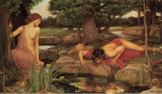 헤라의 저주로 숨어살던 에코는 어느 날 숲속을 지나가던 잘생긴 미남 나르키소스를 마주칩니다. 에코는 한눈에 반하게 됐어요. 무작정 나르키소스를 몰래 따라가던 중 무언가 낌새를 느낀 나르키소스는 묻습니다.