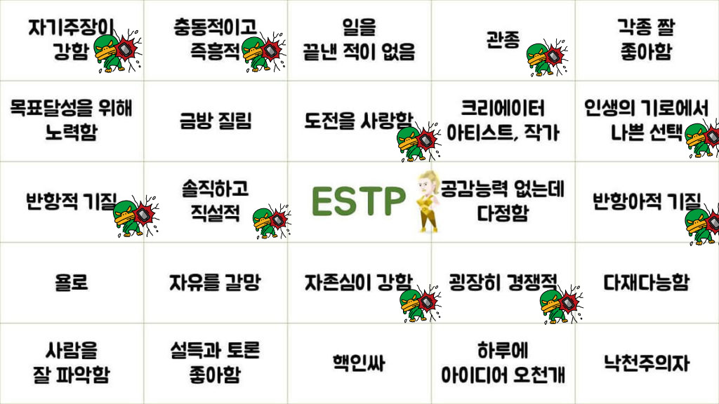 ESTP(사업가)는 항상 주변 사람에게 영향력을 행사하곤 합니다. 사업가는 이론적이고 추상적인 개념과 지루한 토론에는 관심이 없습니다. 지능이 높고 활기찬 대화를 유지할 수 있는 성격이기는 하지만 현실적인 주제에 대해 이야기하고 직접 행동하는 성격이기 때문입니다. 이들은 계획을 심사숙고하기보다는 먼저 행동하고 시행착오를 겪으며 실수를 바로잡기를 원합니다.