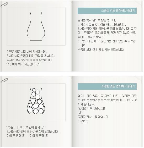 Dr. 스티브 코비가(물론 본인은 망했지만) 성공하는 사람들의 7가지 법칙에서 청중을 불러다놓고 시연한 아주 그럴싸한 업무처리방식이 있죠. 주어진 큰 돌과 모래를 한 바구니에 담는 퍼포먼스였습니다. 당연히 큰 돌을 먼저 넣고 모래를 부어야 틈새 사이사이로 모래가 들어가면서 틈을 가득 메웁니다. 물론 이 강연에선 소중한 것을 먼저하라는 눈물나는 자기계발 메시지가 있었지만, 업무에서 중요한 건 소중한 일을 먼저 처리하는 것이 아닙니다.