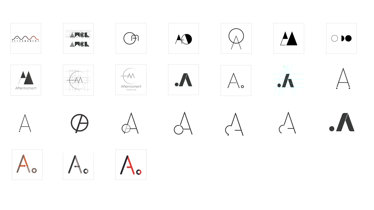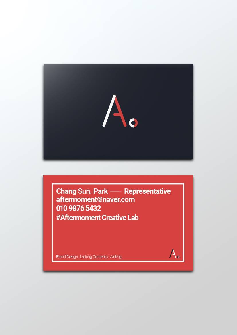 난리부르스를 쳐서 현재의 로고가 만들어졌죠. A는 당연히 애프터모멘트의 이니셜이고 똥그라미는 마침표입니다. 원래 모멘트라는 게 '순간' 아니겠습니까. 고민되고 어려웠던 브랜드콘텐츠 고민은 이제 안녕~ 이라는 뭐 나름의의미를 담고 있습니다. 투 톤 컬러를 쓴 이유는 디자인과 텍스트의 두 가지 콘텐츠를 다루고 있기 때문이예요. 차가운 이성과 정보성 콘텐츠를 의미하는 진한 파랑과, 감성과 가치를 의미하는 진홍색을 썼습니다.