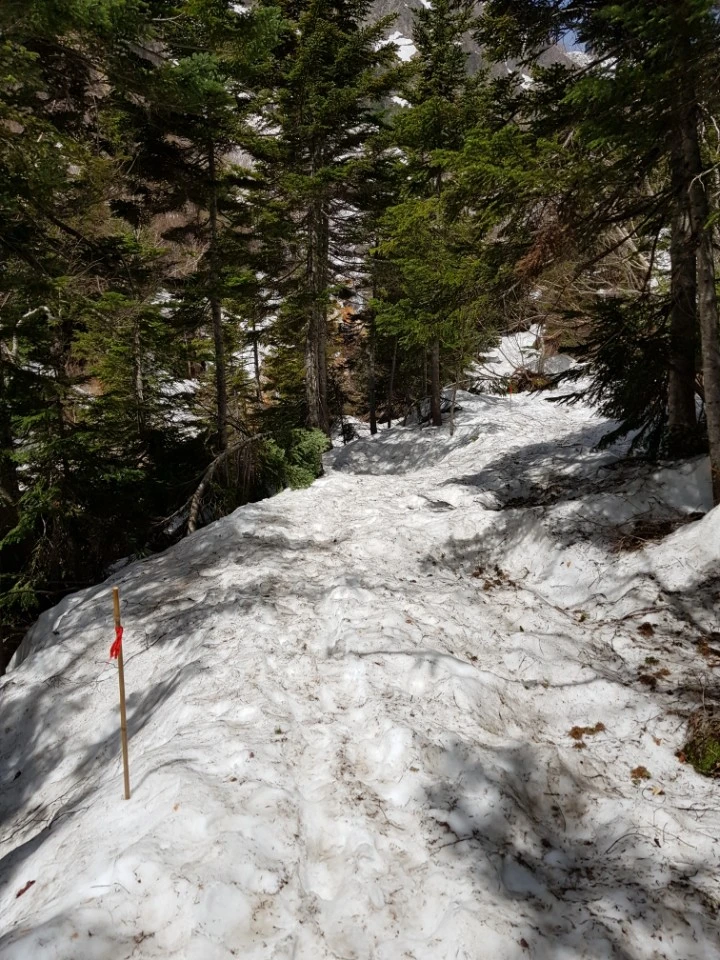 돌길이 이어집니다. 무릎과 발목을 상하게 만들 수 있는 좋은 방법이죠. 고도가 높아지면서 중간중간 눈이 보이기 시작합니다. 저 눈도 이제 녹고있는 무렵이야 질퍽질퍽한 기분나쁜 상태가 되었어요.