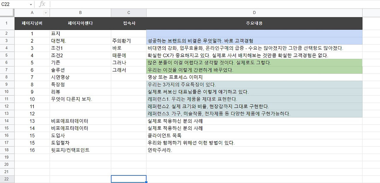 그래서 초반 작업은 늘 엑셀이나 구글 스프레드시트로 시작한답니다. 각 페이지의 논리구조를 먼저 잡고 한 문장으로 요약된 문장들을 다듬는데 더 많은 시간을 투자해요. 실제로 페이지구성과 텍스트를 잡는데 50%이상의 시간이 쓰이는 것 같아요.