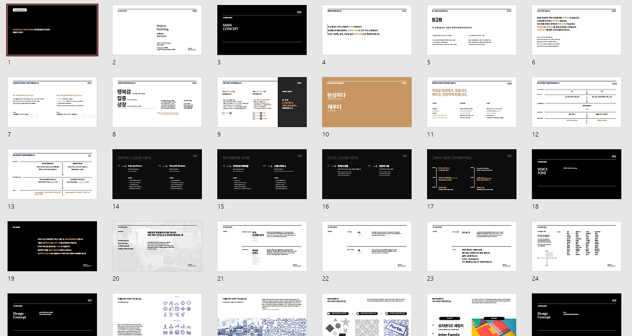 보통 소개서 만들자고 하면 핀터레스트같은 디자인 레퍼런스 사이트부터 뒤지는데...레퍼런스는 말 그대로 레퍼런스일 뿐이고, 삘은 그다지 믿을만한 게 못됩니다. 정리된 근거가 있어야 흔들리지 않고 1~2개월 여간의 제작작업을 꾸준히 이끌어 나갈 수 있죠. 물론 이건 제가 INTJ라 그런 것이니 혹시 ENFP시라면 다양하게 먼저 시도해보고 다시 만드는 방법을 택하실 수도 있습니다. 모로가도 좋은 결과물로만 가면 되는 거니까요.