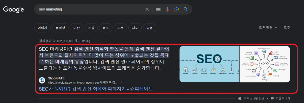 구글 스니펫(google snippet)이란, 구글 검색 결과 최상단에 상자 형태로 나타나는 확장된 검색 결과를 의미한다.