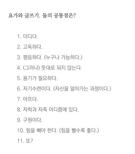 <요가매트만큼의 세계>는 내가 오랫동안 몇 번이고 꺼낸 책 중에 하나이다. 잔잔하게 쓰인 이 에세이가 나에겐 일상의 응원같이 다가오기 때문이다. 그중 요가와 글쓰기는 매번 읽어도 공감된다. 공감과 동시에 속이 쓰린다.